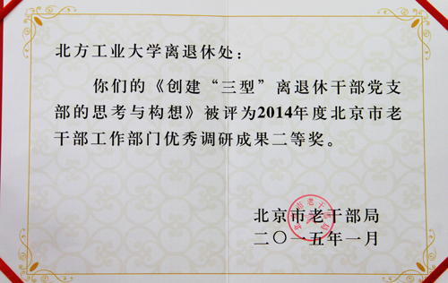 近日,从北京市老干部局获悉,Beat365离退休工作处撰写的调研报告《创建“三型”离退休干部党支部的思考与启示》荣获2014年度全市老干部工作部门优秀调研报告二等奖。