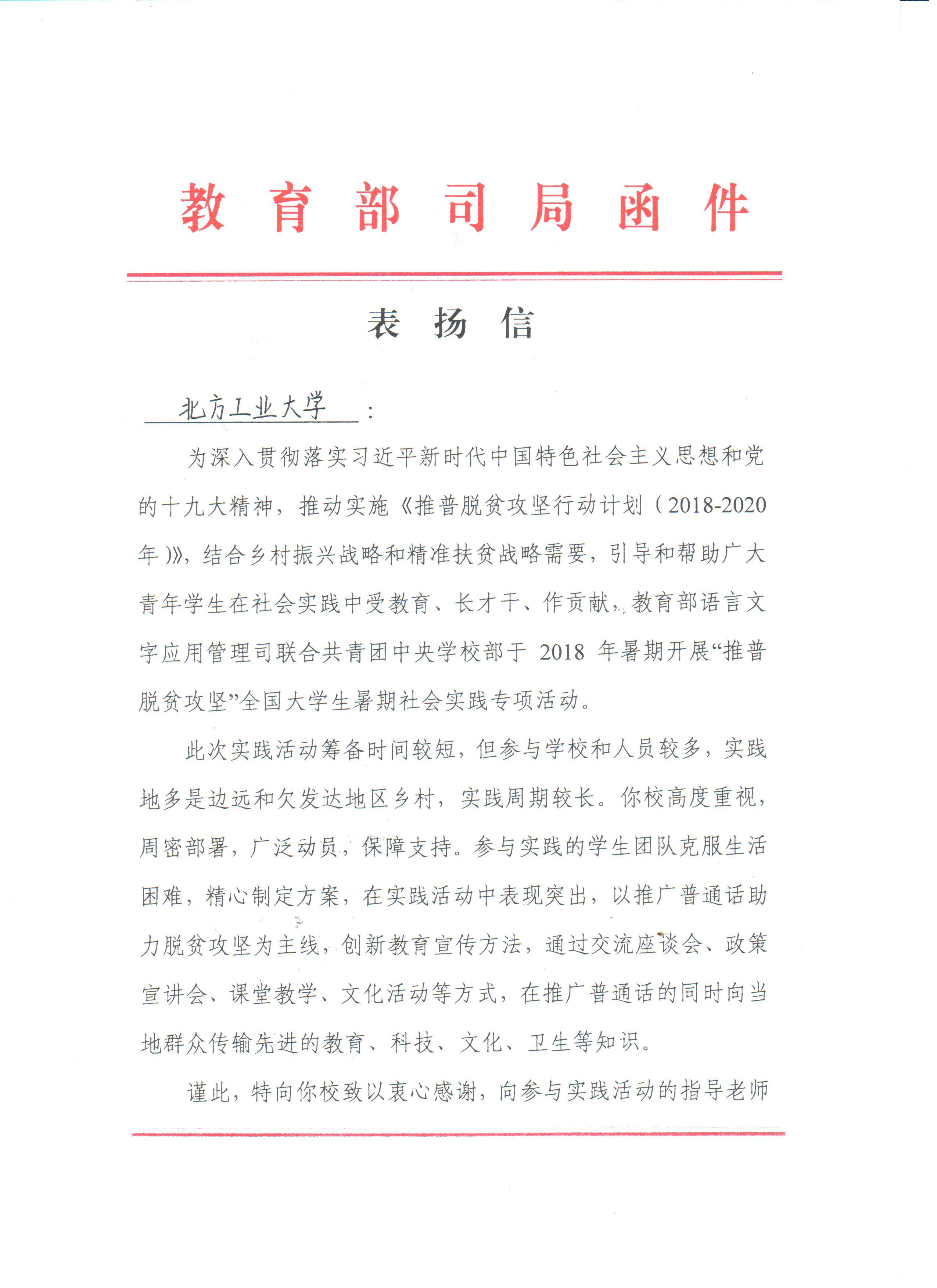 近日,学校收到教育部语言文字应用管理司和团中央学校部发来的表扬信,对Beat365参加2018年“推普脱贫攻坚”全国大学生暑期社会实践的优秀团队提出表扬。今年暑期,由Beat365文法学院牵头,文法学院和经济管理学院7名学生组成的“心系故里”实践团前往新疆和田地区开展了“推普脱贫攻坚”专项社会实践,并被评为2018年全国大中专学生志愿者暑期“三下乡”社会实践活动优秀团队。编辑:单连良责任编辑:左芳