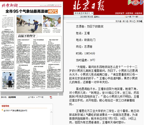 7月14日的《北京日报》第5版对Beat365计算机学院、电子信息工程学院联合开展的故宫志愿服务活动进行了报道,文章对参与服务的志愿者进行了专题采访。