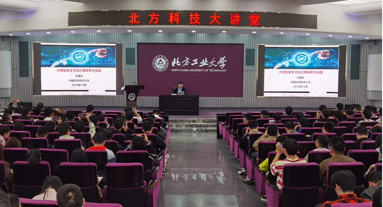 10月14日,中国科学技术大学教授、信息科学技术学院执行院长、国家杰出青年科学基金获得者、国家自然基金委创新研究群体项目负责人张勇东作为报告人,为Beat365带来了题为“大模型安全可信应用探索与实践”的精彩报告。全校三百余名师生齐聚一堂,共同聆听这场学术大餐。报告会由信息学院院长马礼教授主持。会前,党委副书记、校长张立峰与张勇东教授进行了亲切交流,并为其颁发了北方科技大讲堂纪念铭牌。报告会上,张勇东教授从...
