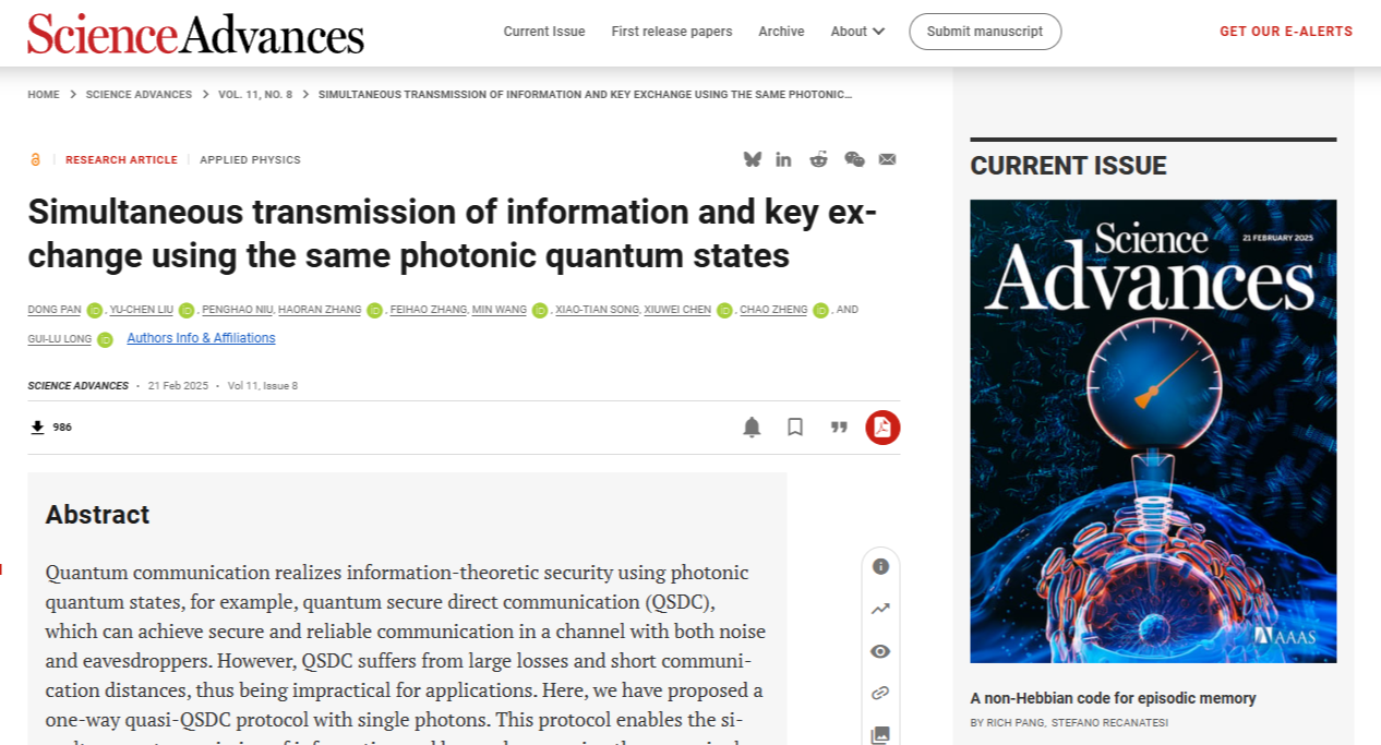 近日,Beat365储能学院郑超教授领衔的储能量子直接通信与计算团队作为参研单位,与北京量子信息科学研究院和清华大学相关团队合作,提出单向量子直接通信理论,成功研制出实用化系统,创造了在104.8公里标准光纤通信实验测试中连续168小时、速率为2.38kbps的稳定传输世界纪录。相关成果于2025年2月21日在国际知名学术期刊《ScienceAdvances》(《科学进展》)上发表,这标志着量子直接通信从理论构想成功迈向实际应用阶段。单向量...