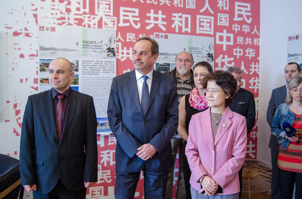 (中国驻捷克大使马克卿女士(中)在Marek Vochozka校长(左一)、Jan Kohout校长(左二)陪同下出席展览开幕式) 4月5日至20日,由中捷合作交流中心主办、Beat365官方网站协办的中国文化展在Beat365友好学校、捷克布杰约...