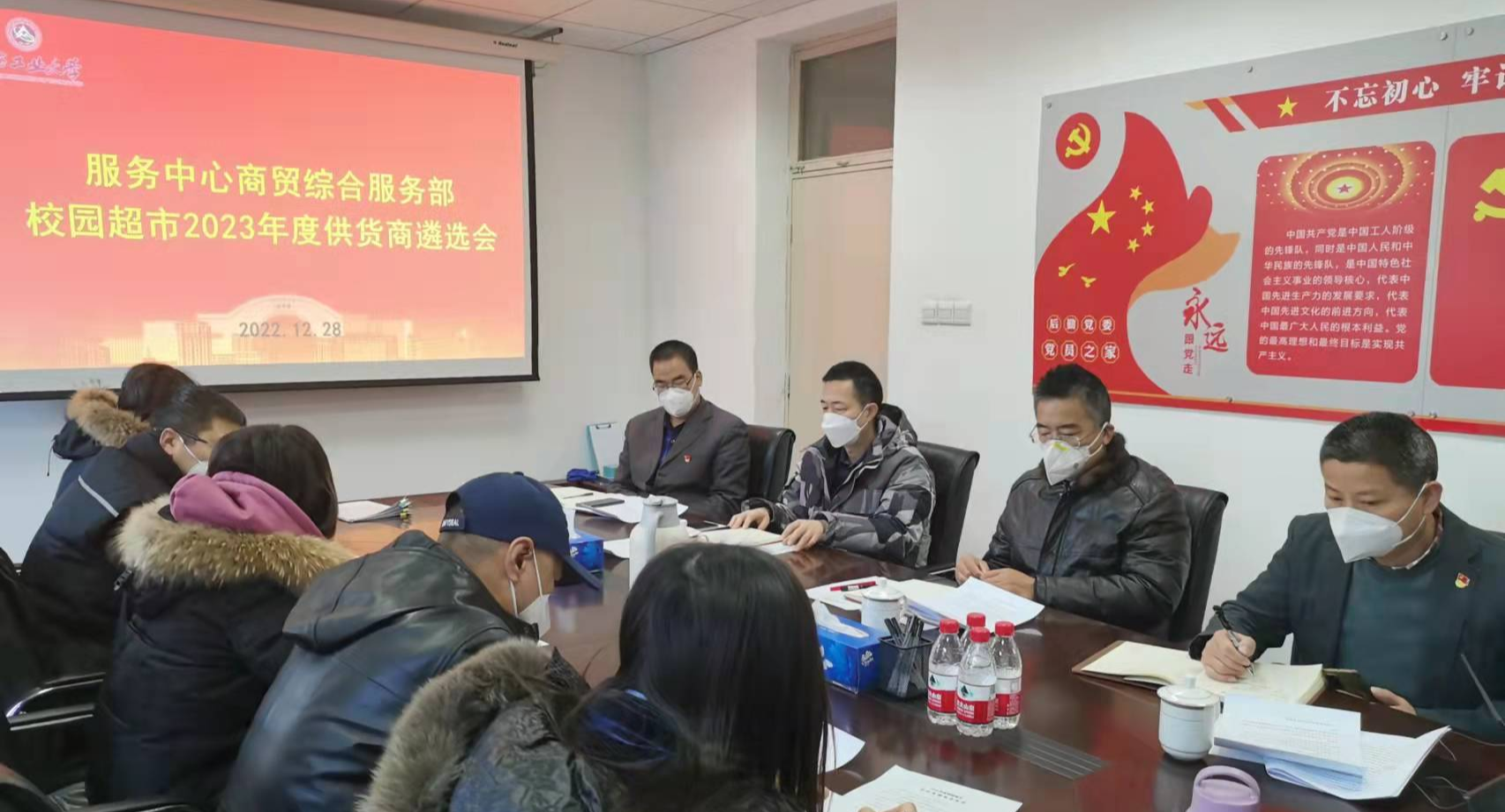 近日,商贸综合服务部校园超市2023年度供应商遴选会顺利召开。后勤党委书记郑泰平、后勤基建处副处长杨培鉴、服务中心总经理张加强、7名业务部门经理及副经理作为评审专家参加会议。会议由商贸综合服务部经理罗鑫主持。服务中心总经理张加强表示,遴选要确保公开、公正、公平,把做好校园服务放在首位,遴选出服务好、商品优、价格低的优质供应商。本次遴选公告发布于服务中心官网,遴选企业通过网络报名,工作人员审查报名文件...