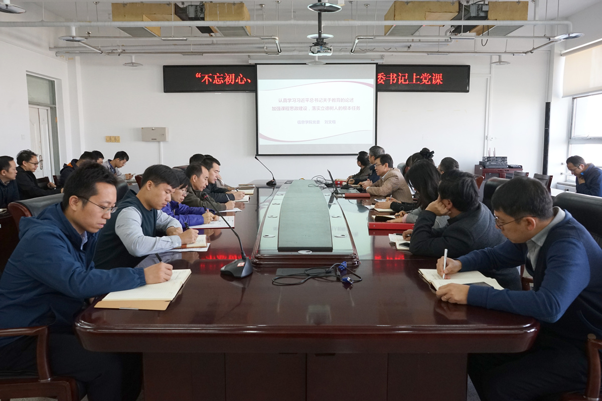 根据学院主题教育安排,10月29日上午,信息学院党委书记刘文楷在瀚学楼1014会议室以“认真学习习近平总书记关于教育的重要论述,加强课程思政建设落实立德树人的根本任务”为主题给学院党委委员和全体支部书记上党课。主题党课上,刘文楷结合我国高等教育的基本情况、高校思想政治工作面临的挑战、存在的问题、习近平总书记关于教育改革发展提出的一系列新理念新思想新观点分享了自己在学习中的感想和体会。他强调,立德树...