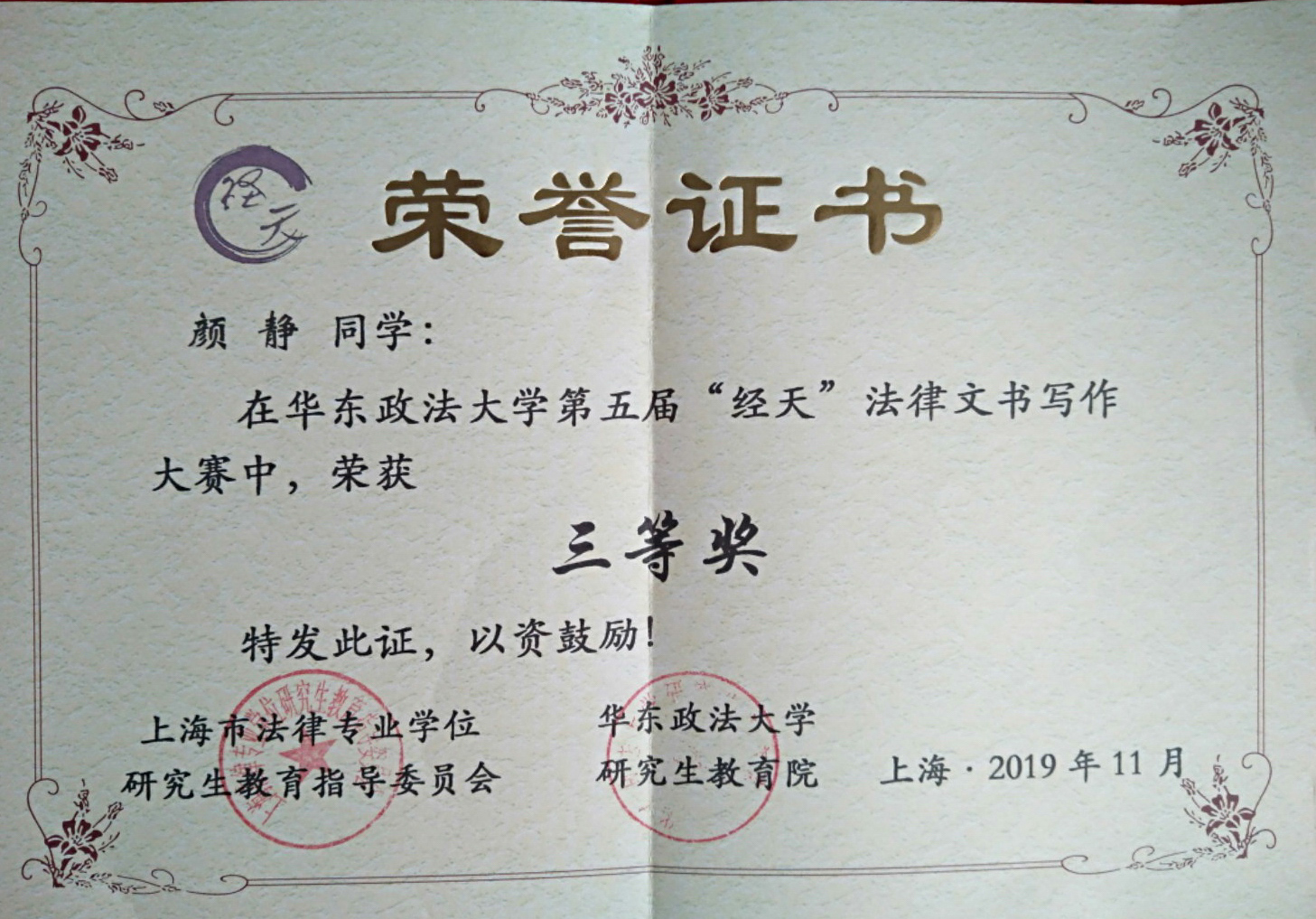 Beat3652019级法律硕士研究生颜静在第五届“经天杯”法律文书竞赛中,充分展现法学学子的精神风貌和专业素养,过关斩将,从599位选手中脱颖而出,跻身前六强,荣获三等奖。“经天杯”法律文书竞赛是上海市法律专业学位研究生教育指导委员会和华东政法大学研究生教育院主办,华东政法大学法律硕士教育中心承办的全国性比赛。本次大赛有来自北京大学、同济大学、复旦大学、华东政法大学等57所高校数百名选手参赛。该项成绩的取得得益...