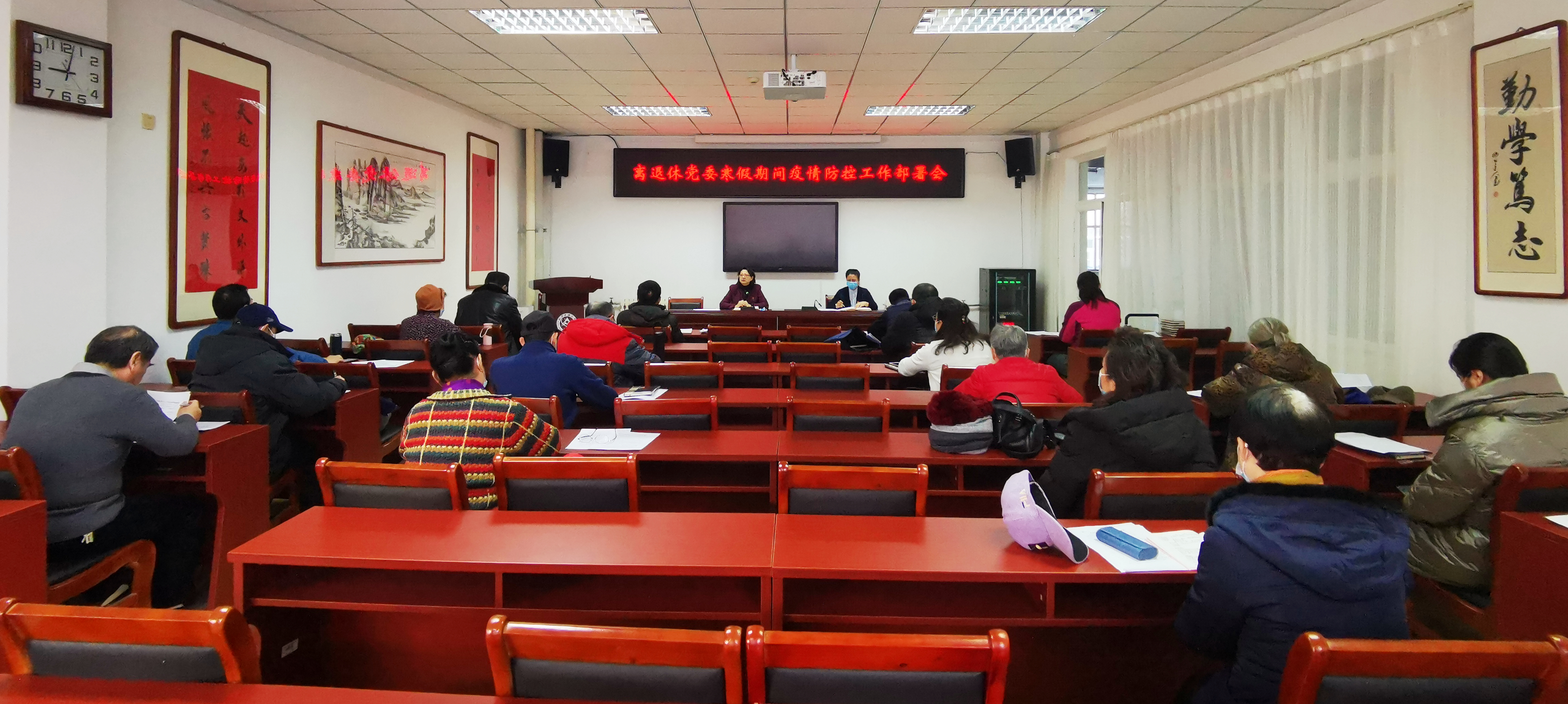 1月13日,离退休党委召开寒假期间疫情防控工作部署会,离退休工作处全体工作人员,离退休人员管理组组长、副组长参加会议。会议召开前一天,学校党委副书记田红芳对寒假期间离退休疫情防控提出三条要求:一是要把离退休人员的信息摸排准,做到人员底数清、动向清、状况清;二是引导老同志科学佩戴口罩,做好个人防护;三是通过公众号、微信群等多种途径在老同志中加强疫情防控宣传。离退休党委书记黄睿传达了学校寒假疫情防控工...