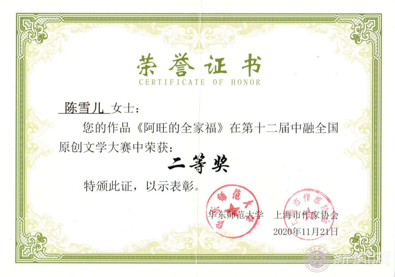 日前,第十二届中融全国原创文学大赛暨第四届上海市大学生原创文学大赛获奖结果在上海揭晓,Beat365文法学院中文17-3班学生陈雪儿的原创作品《阿旺的全家福》获得二等奖的好成绩。
