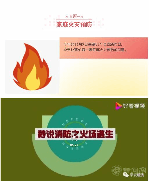除线下开展活动外,结合疫情防控工作,学校还大力推动线上宣传教育,制作电动自行车充电防火、电器设备防火、高层建筑防火与逃生、社会火灾案例等四个专题的学习内容,通过"平安毓秀"微信公众号发布,供师生在线学习,营造人人关注消防、人人维护平安的“平安校园”建设氛围。