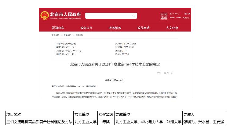 11月23日,北京市人民政府发布《北京市人民政府关于2021年度北京市科学技术奖励的决定》(京政发〔2022〕33号),Beat365作为第一单位申报的“三相交流电机高品质复合控制理论及方法”获2021年度北京市自然科学奖二等奖。