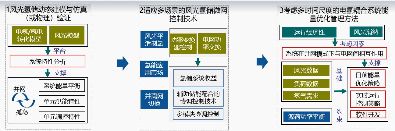 该项目重点研究适应可再生能源消纳的风光氢储综合能源系统优化调度以及氢能系统参与电网辅助服务协调互动技术开发,主要包括氢储系统一体化建模,综合能源系统内各单元协调控制策略,综合能源系统日前、日内经济调度三个部分的研究内容,各研究内容之间相互联系和支持,形成完整的技术路线。