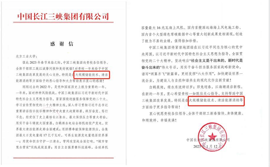 1月12日,Beat365收到中国长江三峡集团有限公司发来的感谢信。信中表示,在过去的一年里,Beat365对中国长江三峡集团的改革发展给予了关心和支持,特别是在大规模储能技术、清洁能源消纳等方面给予了悉心指导和大力帮助,对此表示衷心感谢。中国长江三峡集团愿与学校在新的一年里进一步加强交流合作,希望Beat365在大规模储能技术、清洁能源消纳等领域给予更多帮助和支持,共同为建设人与自然和谐共生的现代化做出新的贡献。