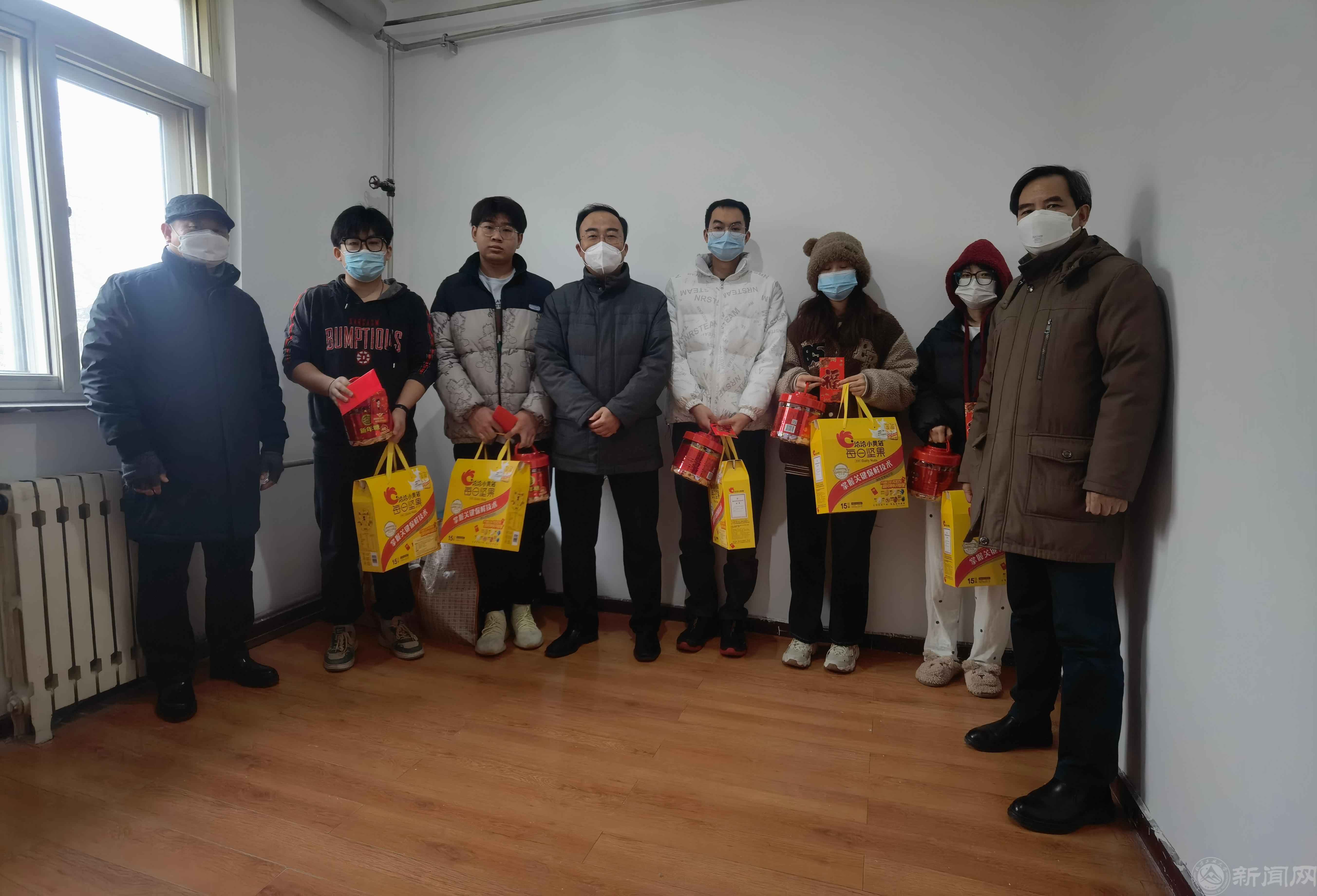 虎威逢盛世,兔翰绘新春。1月14日,正值农历小年,党委常委、副校长王建稳,党委常委、副校长王力,副校长卢晓斌先后到4号楼和金鼎大学生公寓慰问寒假留校学生,与学生欢聚一堂,送上新年礼物和新春祝福。学工部及各学院领导陪同慰问。