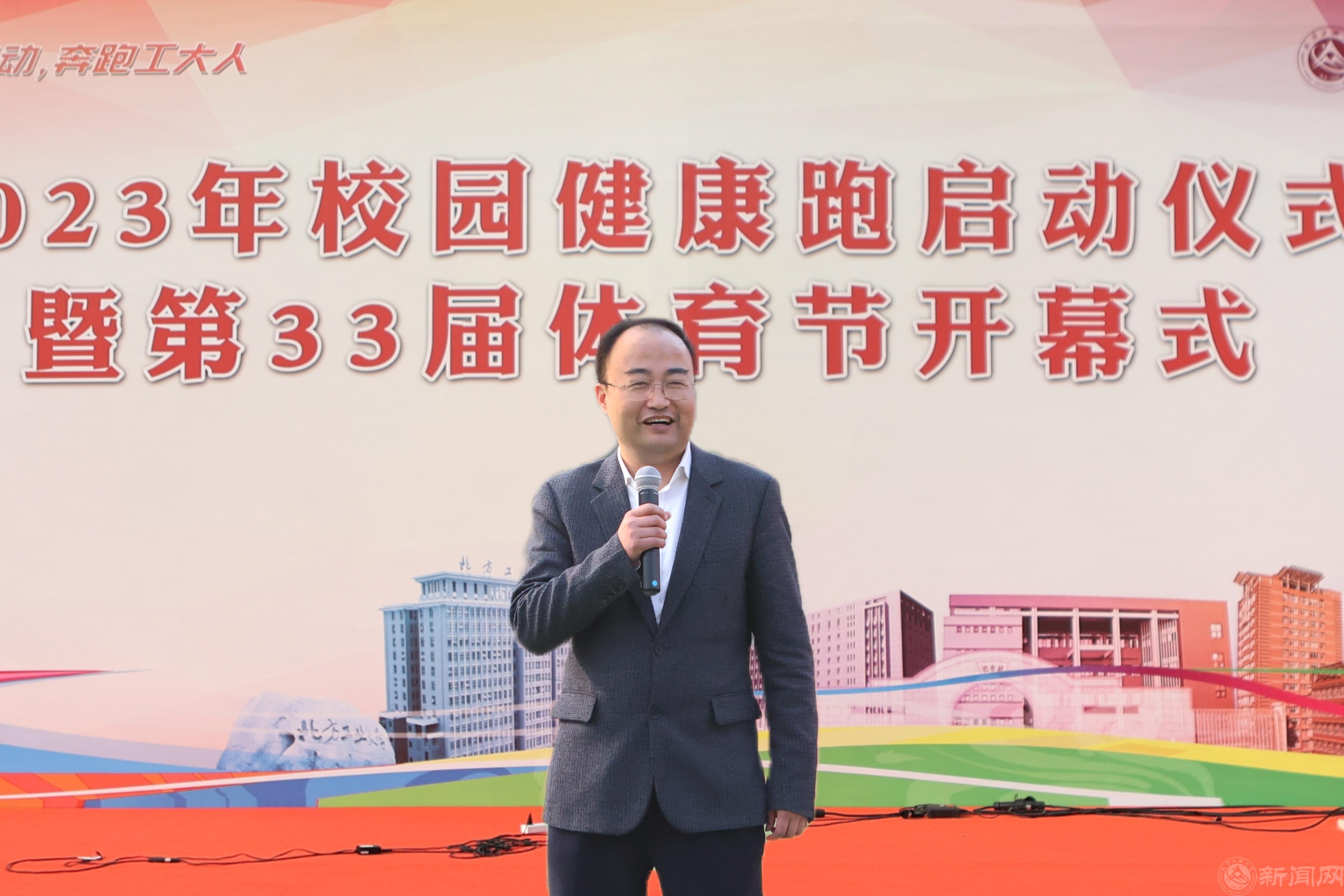 王力宣布2023年校园健康跑活动启动和第33届体育节开幕,并作动员讲话。他鼓励同学们走下网络、走出宿舍、走向操场,通过跑步让自己享受独处静思,放松身心;他希望同学们树立“每天锻炼一小时,健康工作五十年,幸福生活一辈子”的理念,自发锻炼,强身健体;他强调,在全校上下学习二十大、奋进新征程、奔跑向未来的关键之年,广大青年学子要通过体育锻炼带动勤奋优良学风、自律生活作风、健康向上校风,充分迸发工大人的青春活力,展现工大人的蓬勃朝气。