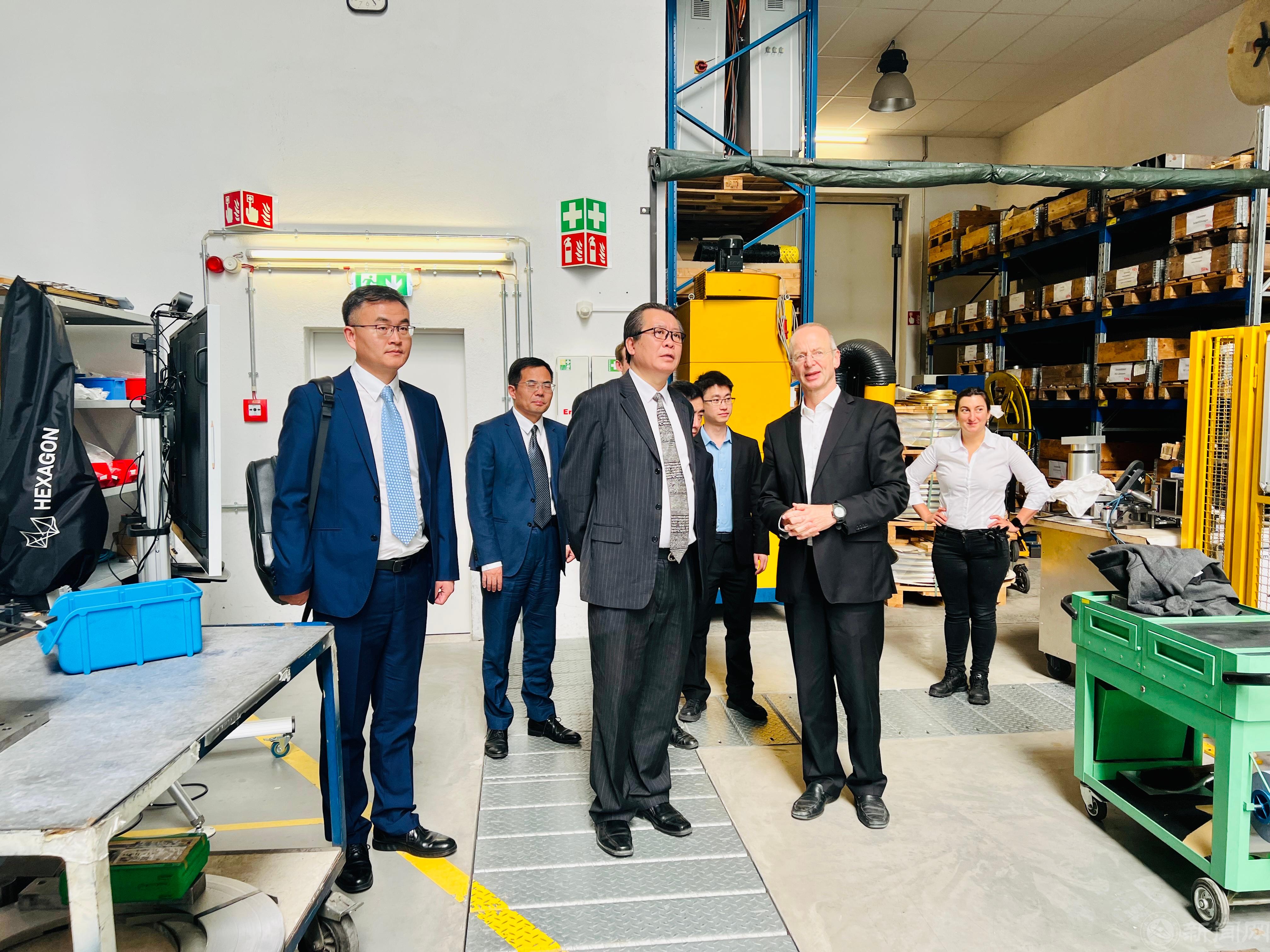 7月8日,代表团访问了达姆施塔特工业大学制造工程与成形装备研究院。德国达姆施塔特工业大学(Technical University of Darmstadt)是德国著名理工科大学,德国卓越理工大学九校联盟成员,制造工程与成形装备研究院(Institute for Production Engineering and Forming Machines)是其所属研究机构。代表团与制造工程和成形装备研究院负责人德国国家科学与工程院院士Peter Groche教授等人深入交流了智能成形制造的学术前沿技术,参观了该研究院智能成形中心(Smart Forming Center)。双方回顾了两校辊弯成形研发团队的合作,并明确两校将继续在辊弯成形领域开展师生及科研的深入合作。