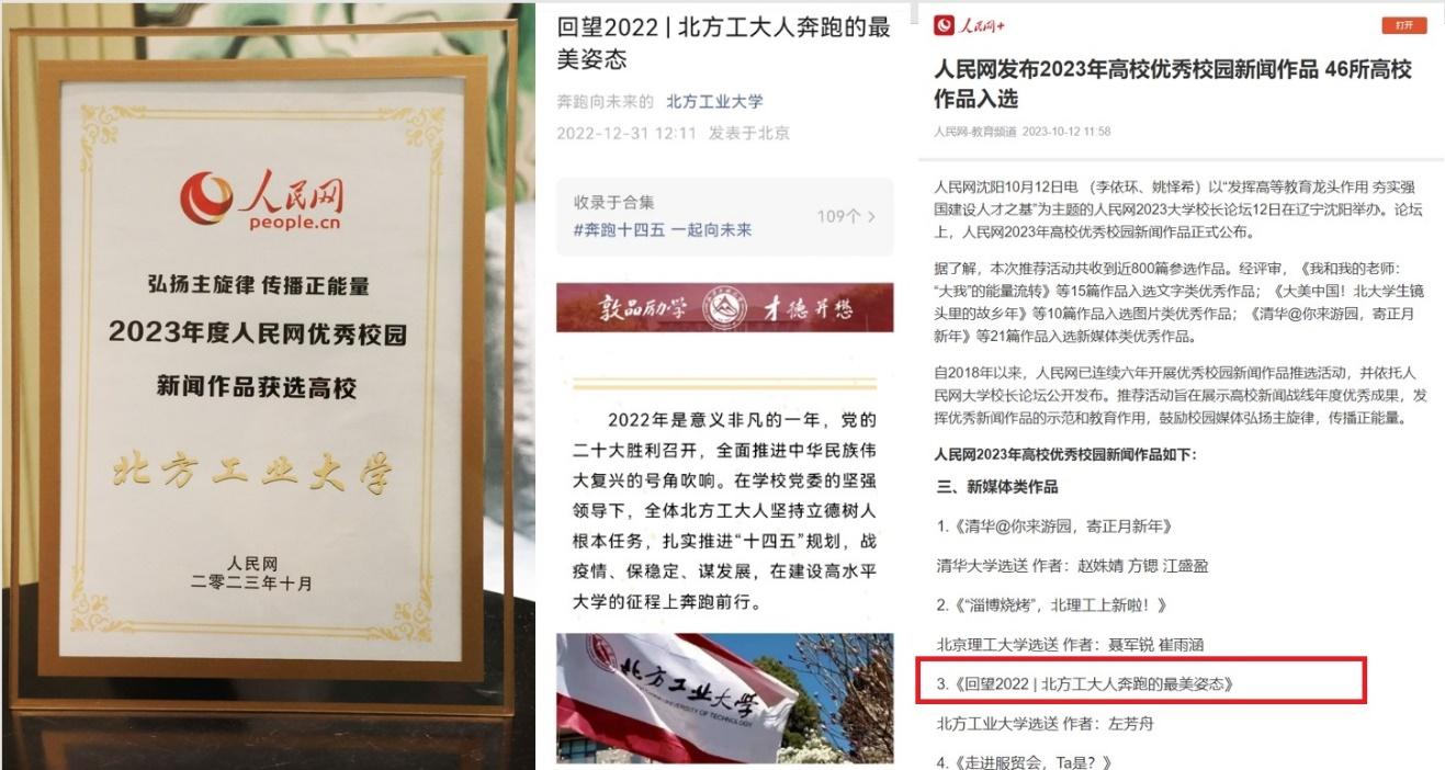 获奖作品《回望2022|北方工大人奔跑的最美姿态》,通过翔实的文字和生动的图片,系统总结和展示了2022年,北方工大人在校党委的坚强领导下,喜迎党的二十大胜利召开,坚持立德树人根本任务,扎实推进“十四五”规划,战疫情、保稳定、谋发展,在建设高水平大学的征程上奔跑前行的奋进姿态,得到专家评委的认可,最终成功入选。