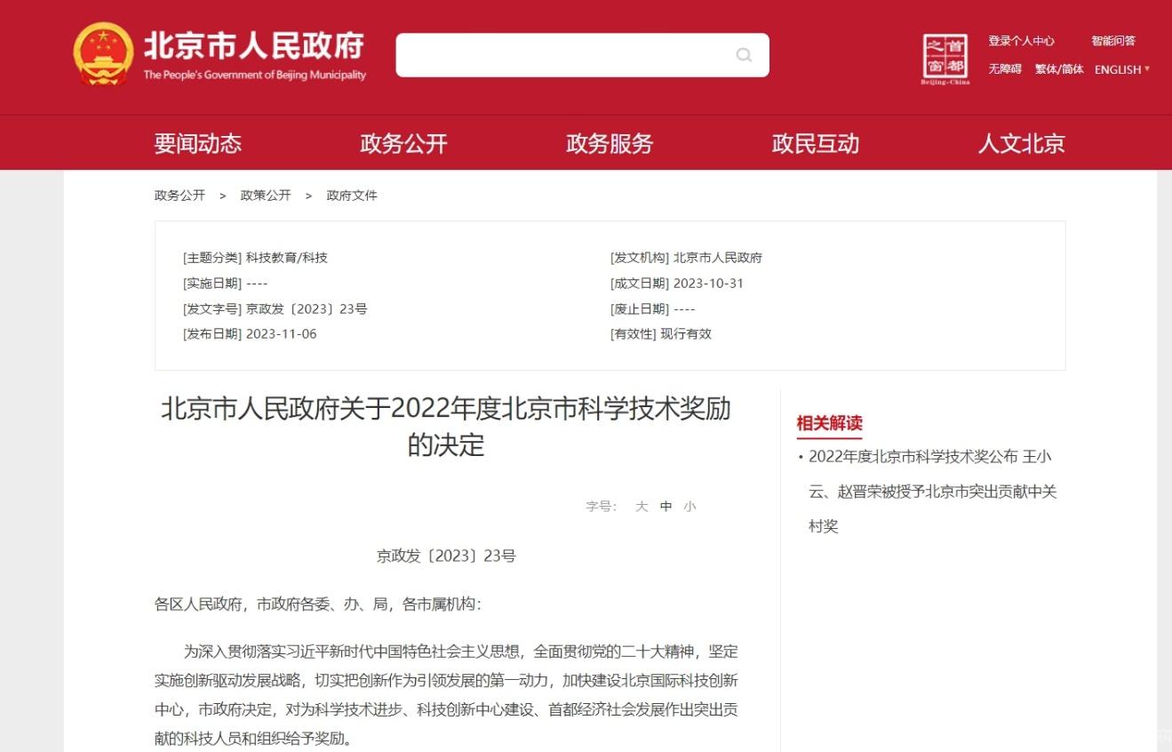 11月6日,北京市人民政府公布《关于2022年度北京市科学技术奖励的决定》,Beat365在此次评选中喜获4项奖励。