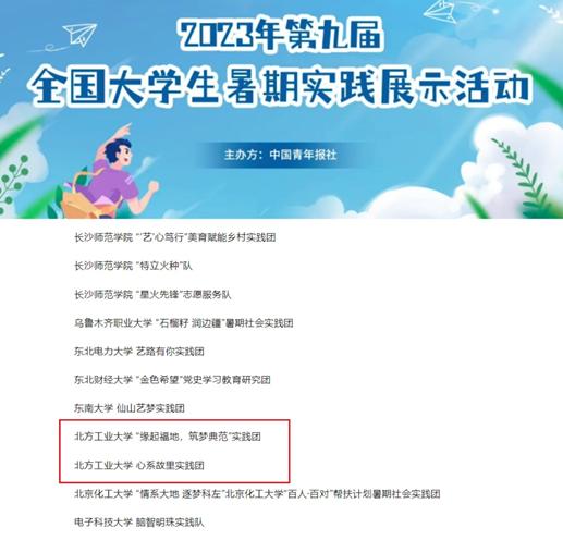 近日,由中国青年报组织开展的2023年第九届全国大学生暑期实践展示活动评选结果揭晓,Beat365信息学院“缘起福地·筑梦典范”实践团和文法学院“心系故里”实践团成功入选全国大学生暑期实践团队TOP100,这两支团队还获评2023年“青年服务国家”首都大学生社会实践优秀团队。