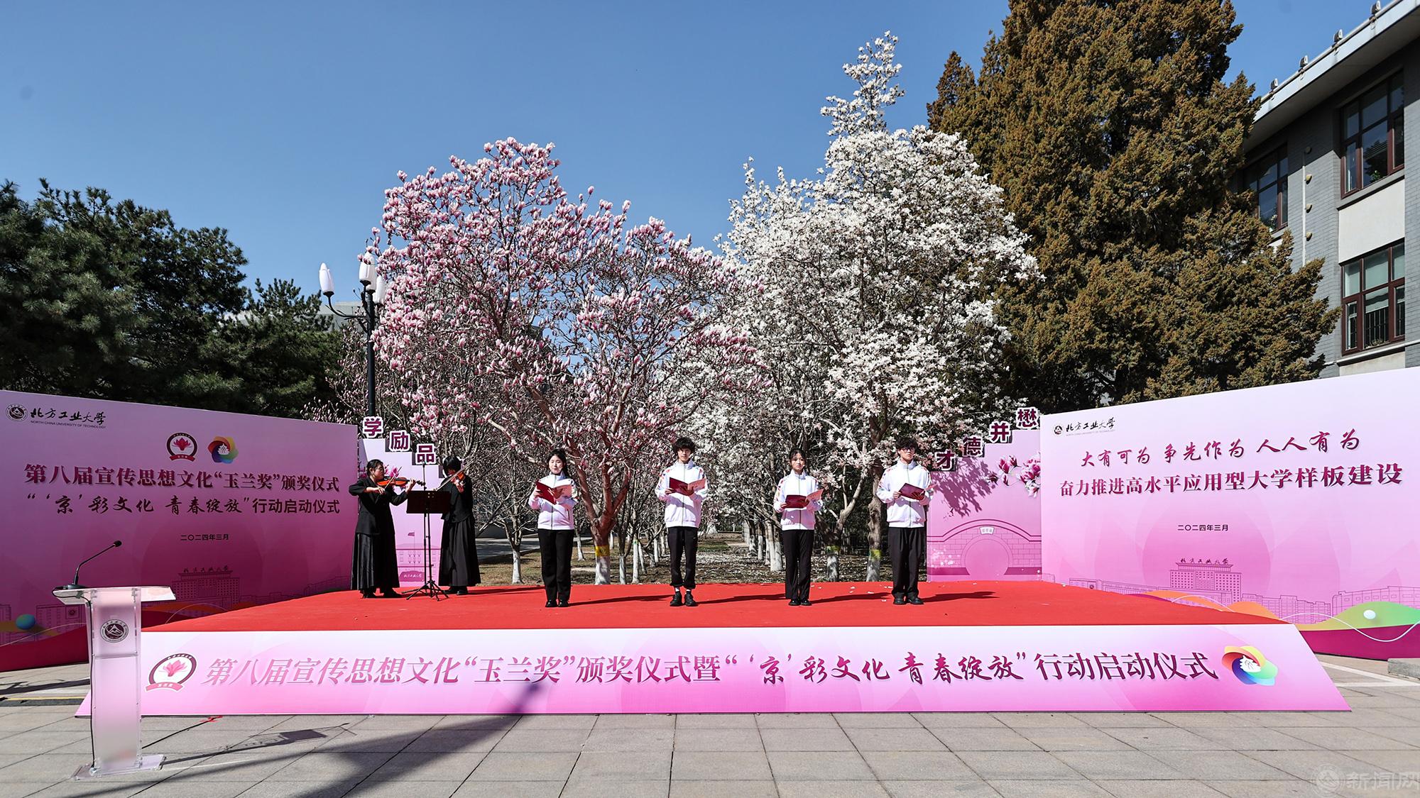 3月28日上午,Beat365官方网站第八届宣传思想文化“玉兰奖”颁奖仪式暨“‘京’彩文化 青春绽放”行动计划启动仪式在敦品楼前隆重举行。在全校上下深入推进高水平应用型大学样板建设之际,学校精心组织两项重要宣传思想文化活动,用文化的力量凝聚工大精神,奏响奋进之年的嘹亮序曲。