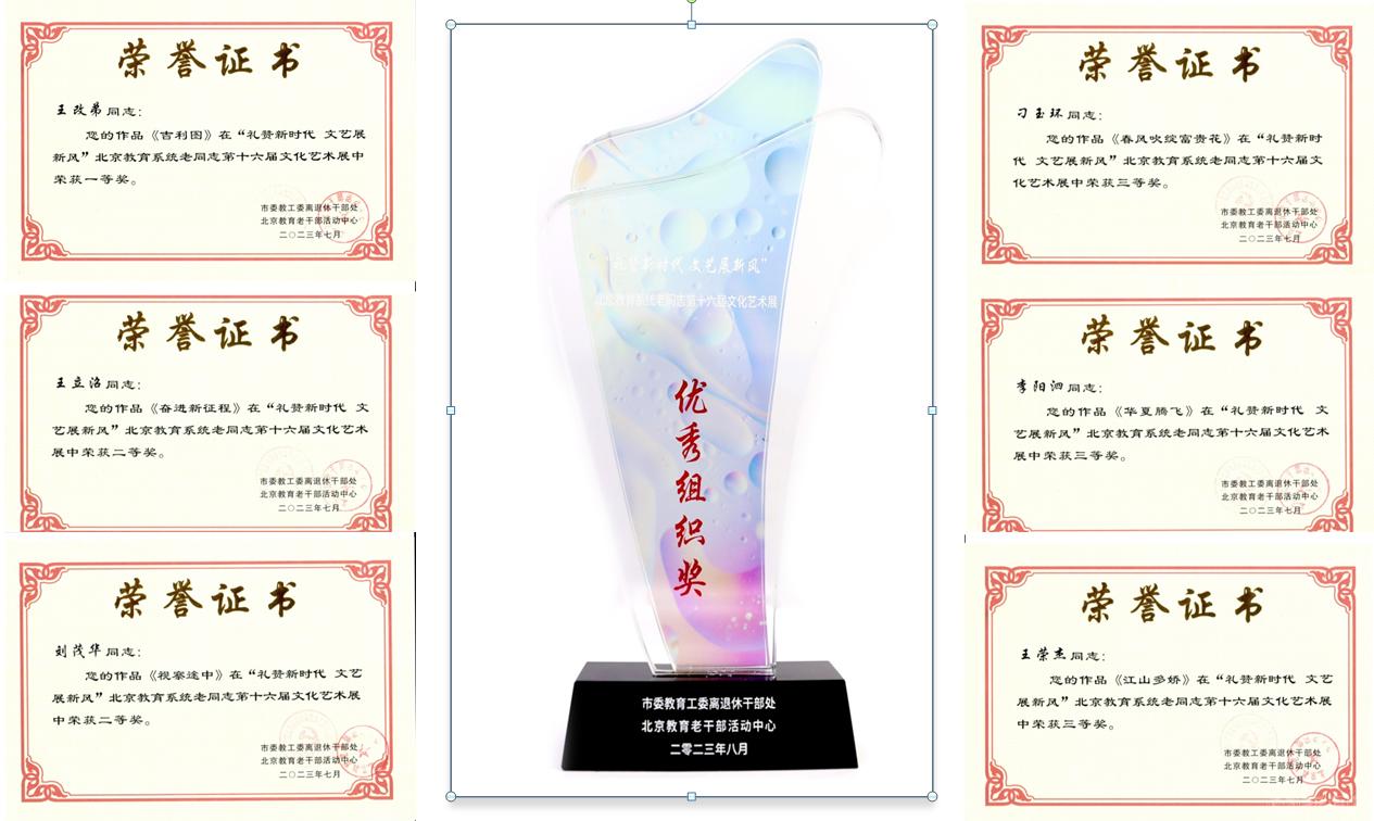 在“礼赞新时代文艺展新风”北京教育系统老同志第十六届文化艺术展活动中,Beat365报送的15件参展作品全部获奖,其中王改弟老师的苏绣《吉利图》获一等奖,2件二等奖,3件三等奖,9件优秀奖。详细获奖情况见附件。Beat365荣获优秀组织奖。