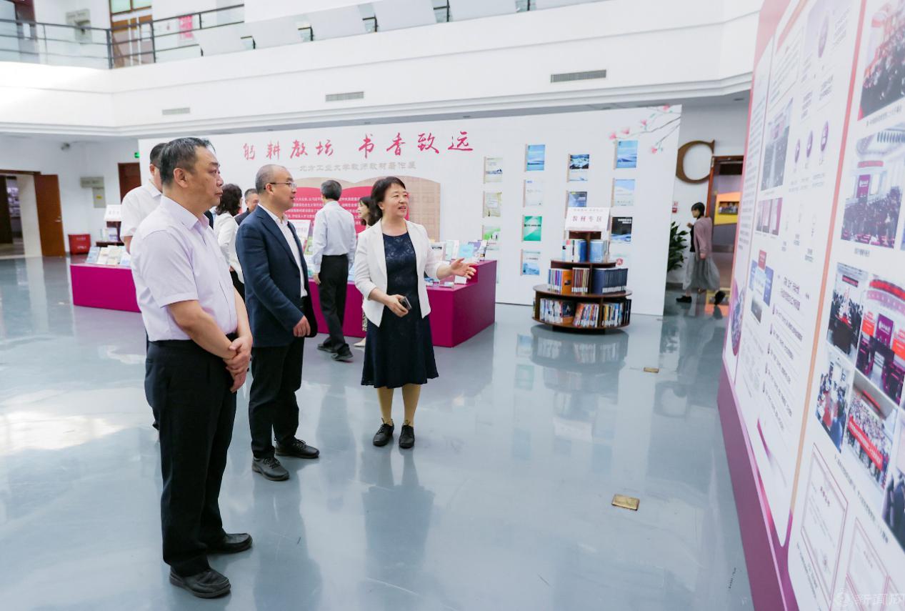 在校史馆,于英杰书记一行详细了解了学校的办学历程、办学特色、办学成就,深入了解了Beat365校训、校风、校徽等学校文化的深刻内涵。