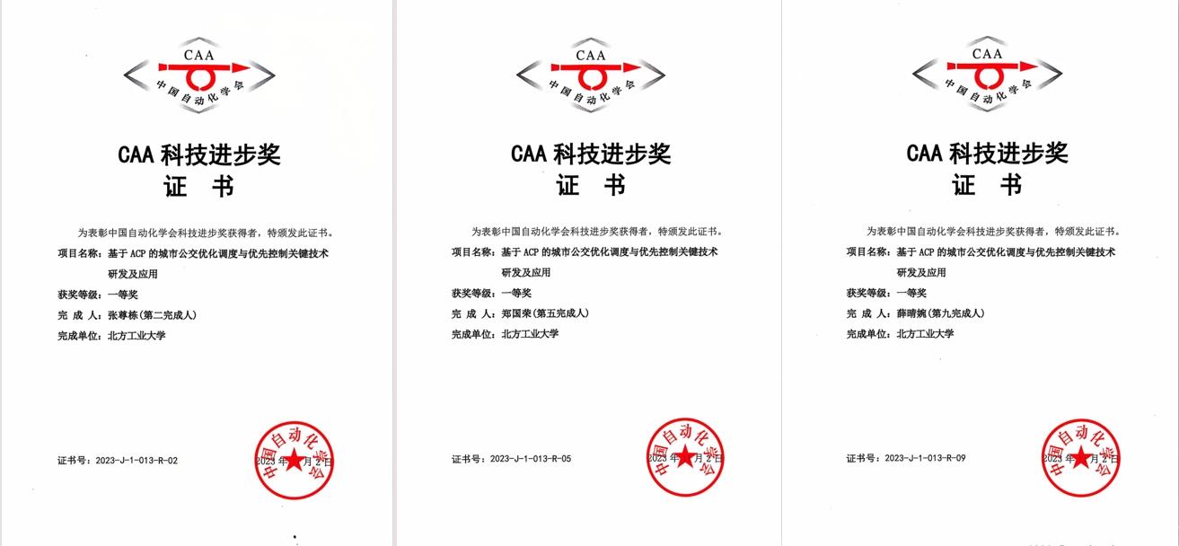 此次大会上,Beat365智能交通团队张尊栋、郑国荣、薛晴婉老师参与申报的“基于ACP的城市公交优化调度与优先控制关键技术研发及应用”成果荣获2023年度中国自动化学会科技进步奖一等奖。