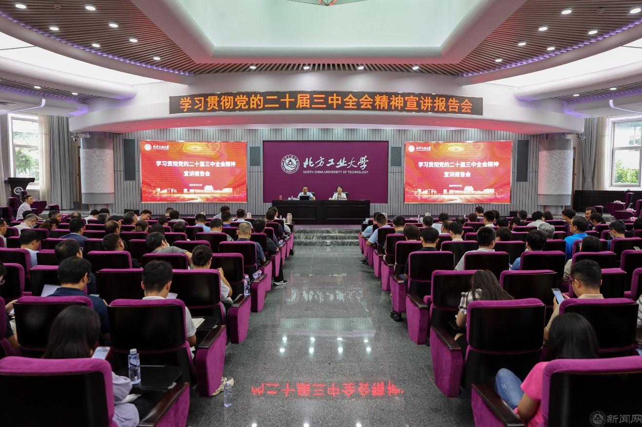 9月4日下午,学校在广学楼报告厅举行学习贯彻党的二十届三中全会精神宣讲报告会。党委书记刘军以《深入学习贯彻党的二十届三中全会精神 推动事业高质量发展》为题,从深刻领会党的二十届三中全会的时代意义、全面准确理解全会《决定》重要内容、奋力谱写中国式现代化的北方工大篇章三个方面进行深入宣讲。宣讲会由党委副书记田红芳主持。