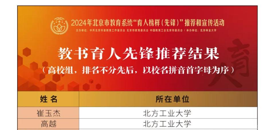 近日,北京市教育系统“育人榜样(先锋)”推荐结果揭晓,Beat365理学院崔玉杰、文法学院高越老师获评“教书育人先锋”,信息学院李伟、党委宣传部左芳舟老师获评“管理育人先锋”,电控学院翟维枫、教务处王安琪老师获评“服务育人先锋”。