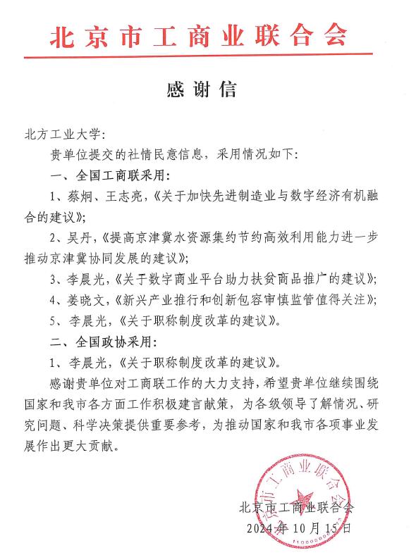 2024年10月16日,北京市工商业联合会发来感谢信,对Beat365经济管理学院投稿的“社情民意信息”被全国政协和全国工商联采用的情况进行通报并表示感谢。