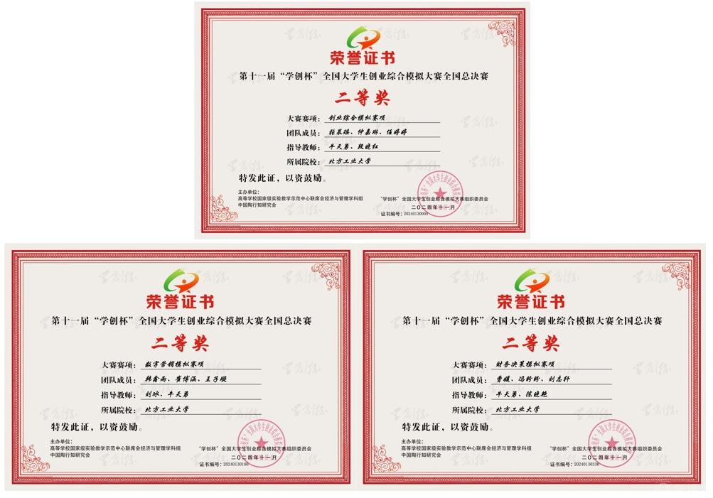 “学创杯”全国大学生创业综合模拟大赛由高等学校国家级实验教学示范中心联席会经济与管理学科组、中国陶行知研究会主办,是中国高等教育学会“全国普通高校大学生竞赛排行榜”A类赛事,至今已举办11届。本次大赛,全国参赛院校超过1500所,参赛团队超过12万支,参赛师生总数近50万人,比赛通过校赛、省赛、全国总决赛三级激烈竞争和严格选拔,最终Beat365经管学院在创业综合模拟赛项、数字营销模拟赛项和财务决策模拟赛项中均获得了全国二等奖的优异成绩。