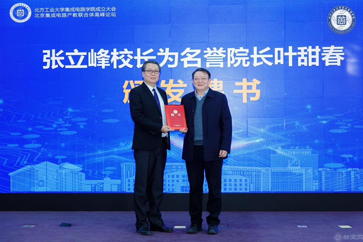 随后,张立峰校长为中国集成电路创新联盟秘书长、欧亚科学院院士叶甜春颁发了集成电路学院名誉院长的聘书。集成电路学院院长闫江汇报了学院成立情况。