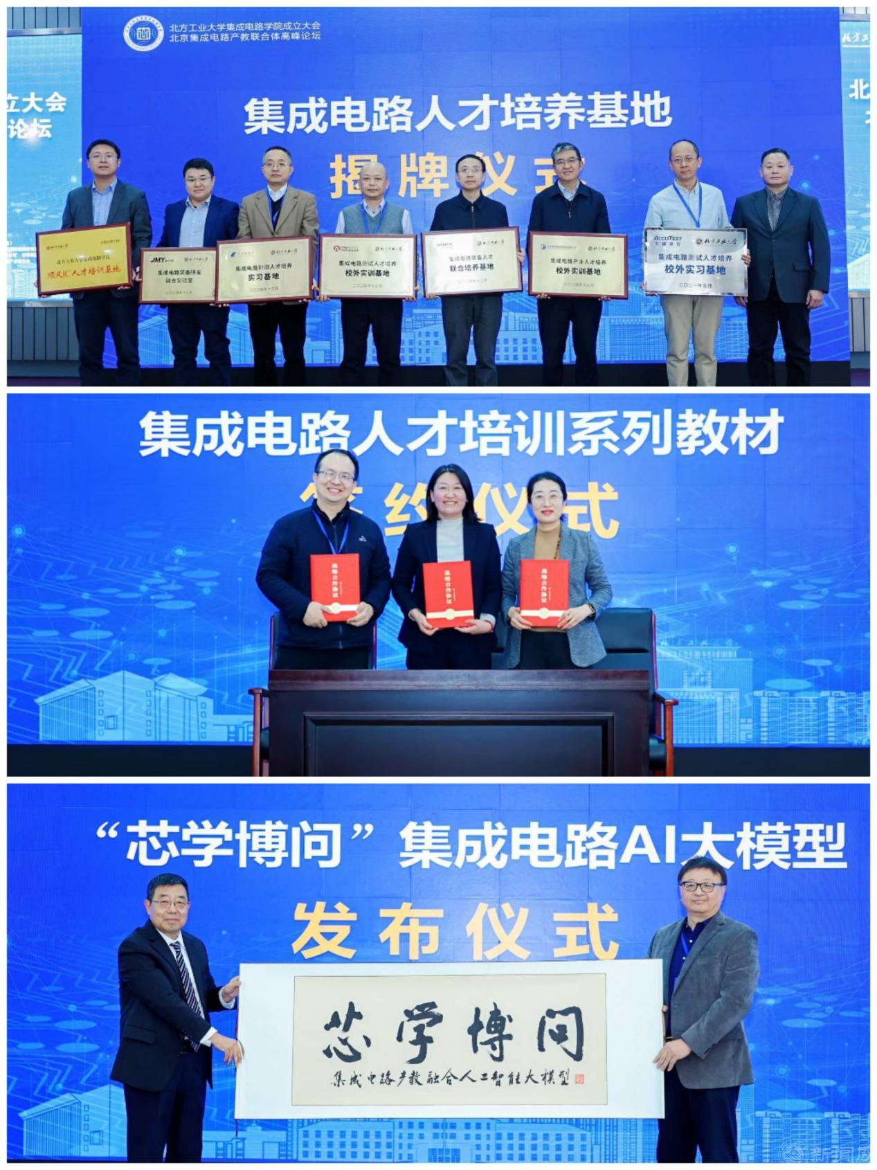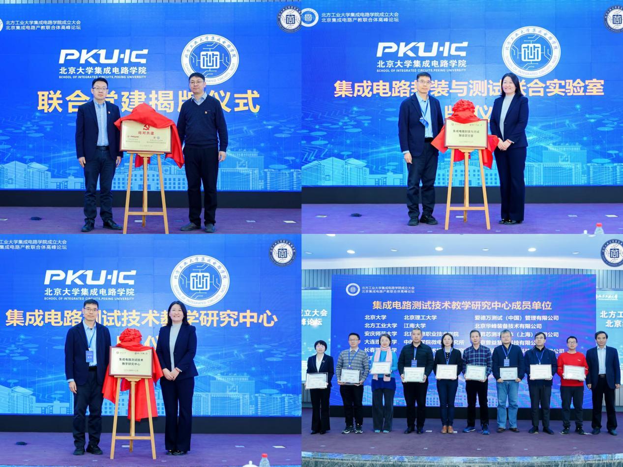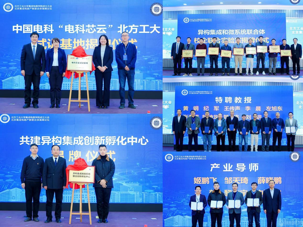 大会还举行了“中国电科‘电科芯云’北方工大试训基地”“北大-北方工大集成电路联合党建”“集成电路封装与测试联合实验室”“集成电路测试技术教学研究中心”“异构集成创新孵化中心”等机构的揭牌仪式。举行了“异构集成和微系统联合体校企联合实验室”企业和集成电路人才培养基地成员单位授牌仪式,以及“集成电路人才培训系列教材”签约仪式等活动。