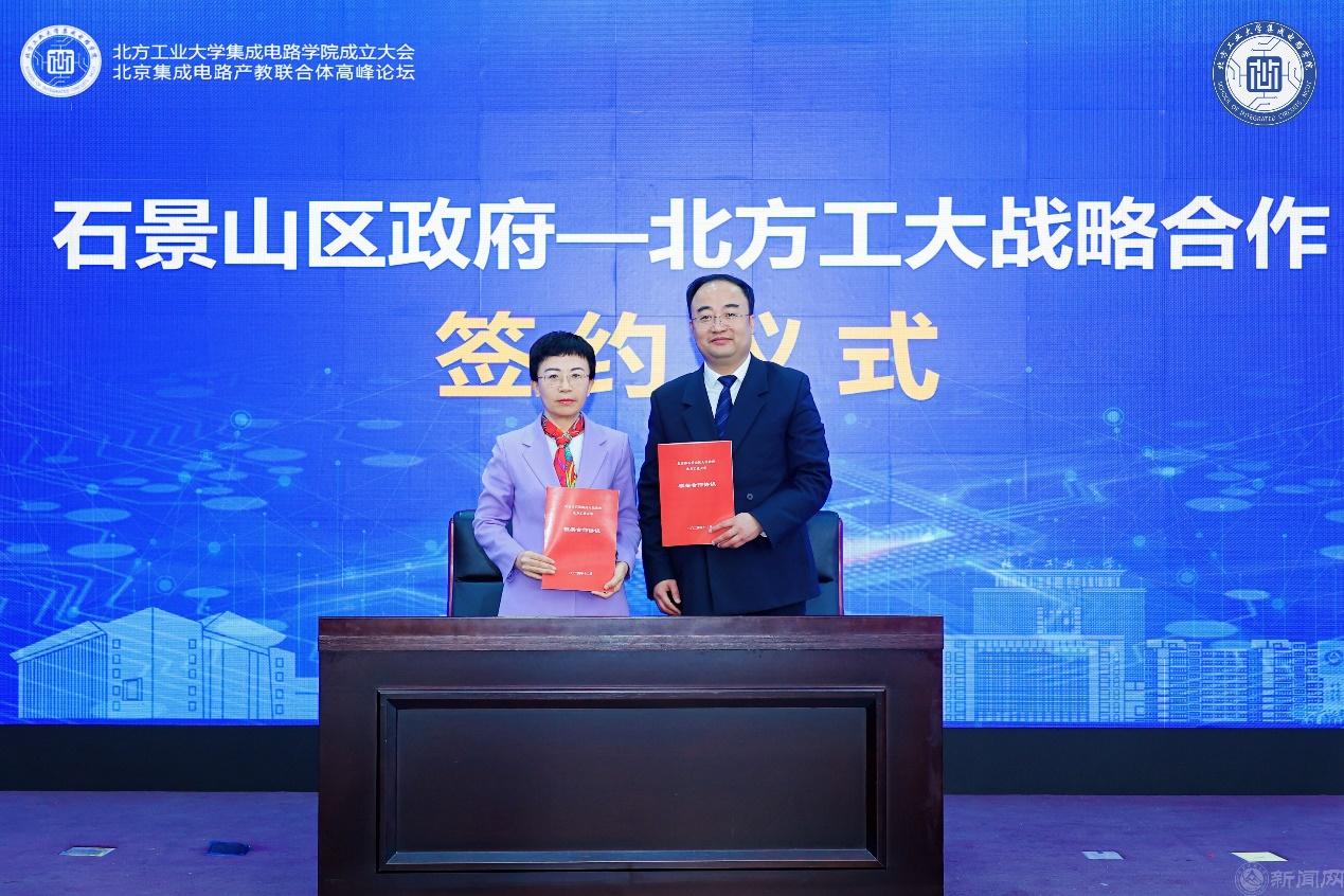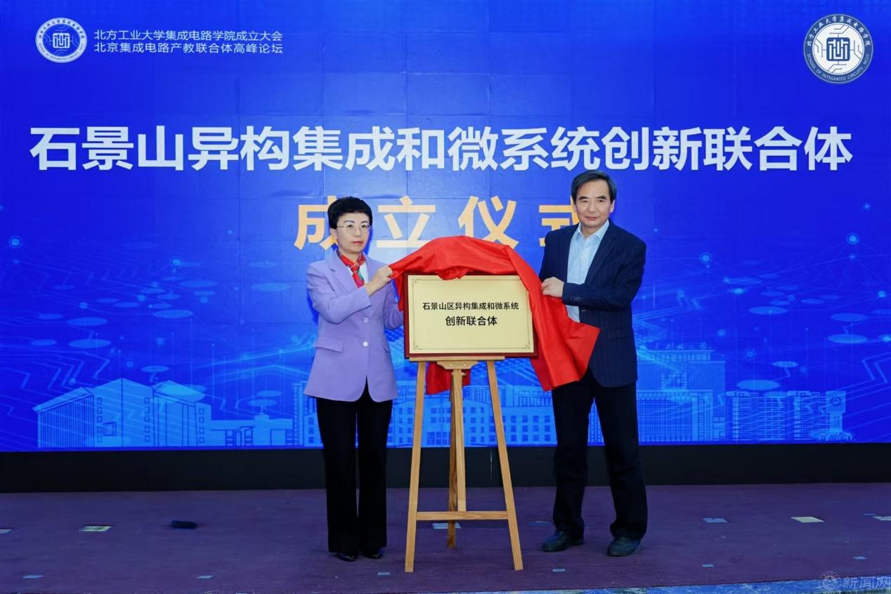 Beat365官方网站党委常委、副校长王建稳与石景山区副区长李文化共同为“石景山异构集成和微系统创新联合体”揭牌。