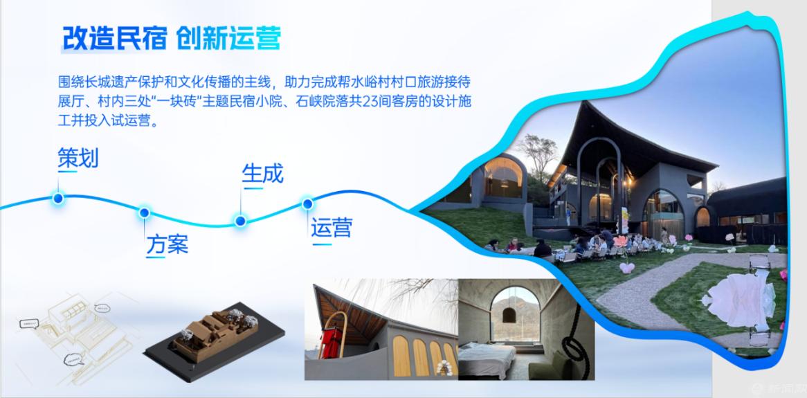 围绕长城遗产保护和文化传播的主线,发掘当地特色文化,孵化了近120个乡村文旅原创性设计方案,涵盖了建筑空间、文创设计、微信表情包、IP形象玩偶、服装创意设计等。截至目前,微信表情包上线点击率过万,近500个文创产品销售一空,促进乡村经济收入超过50万元。
