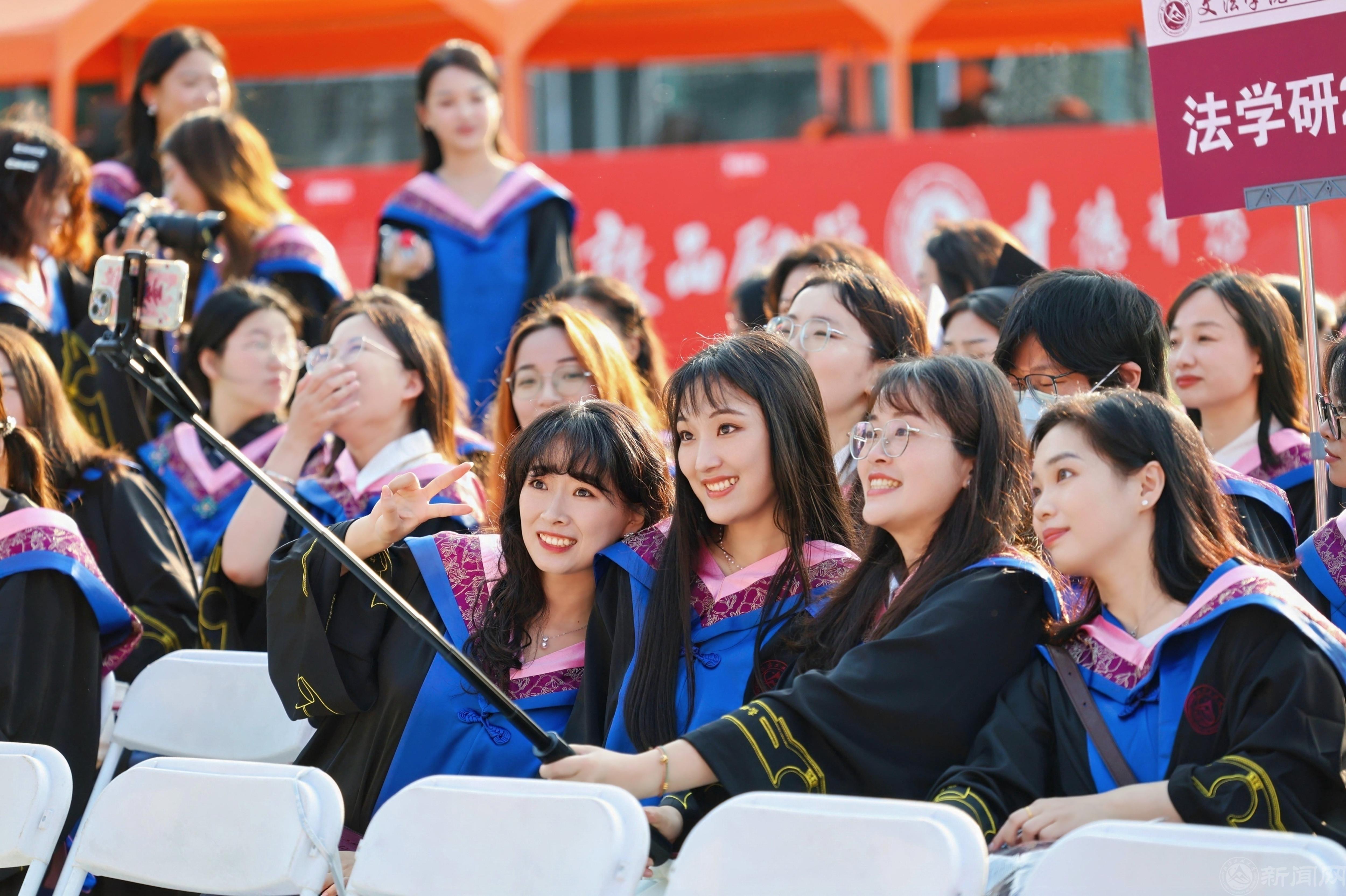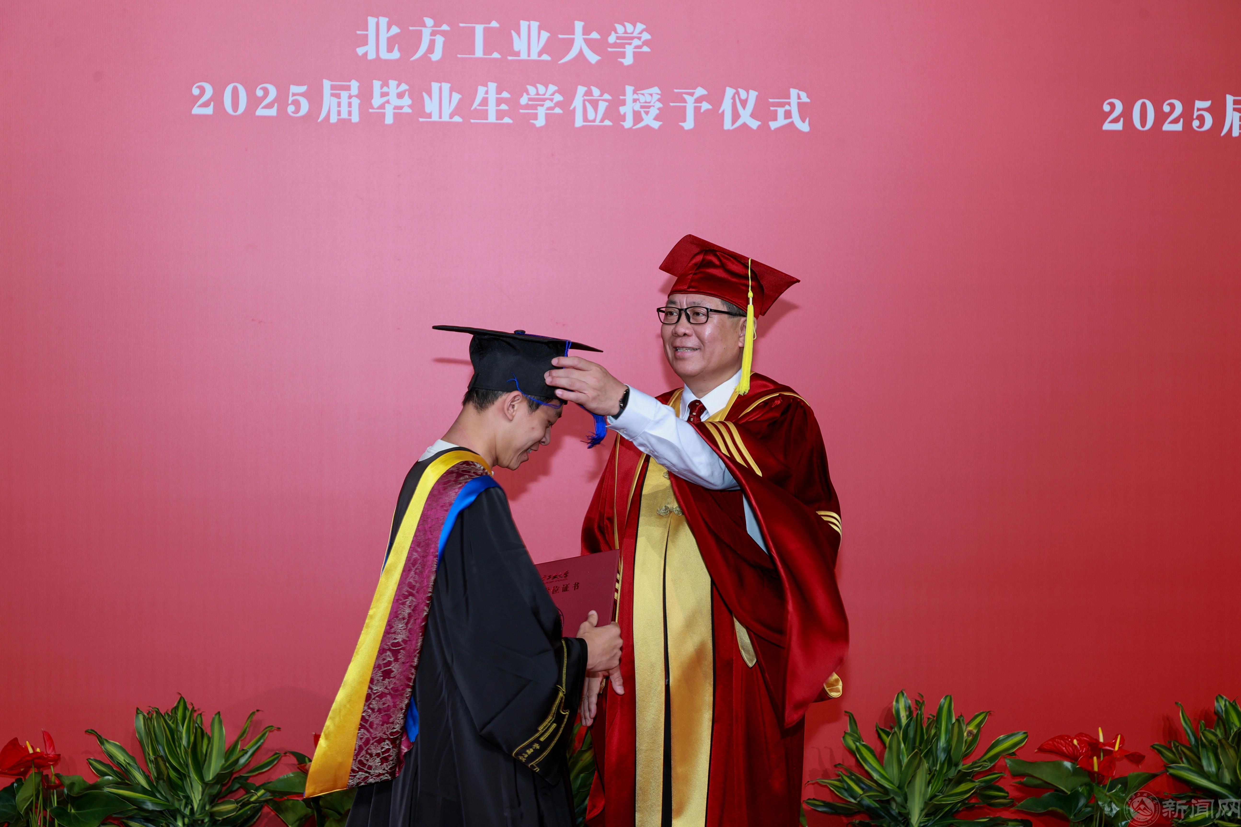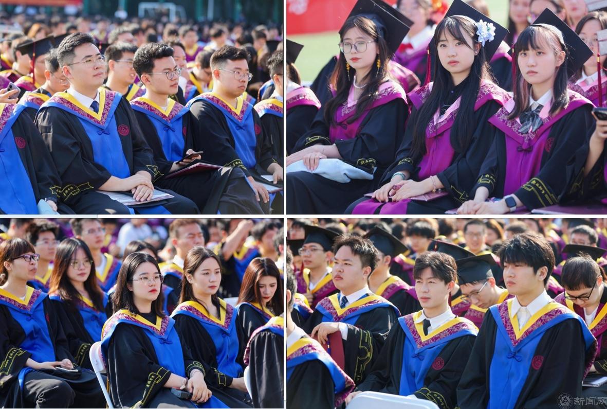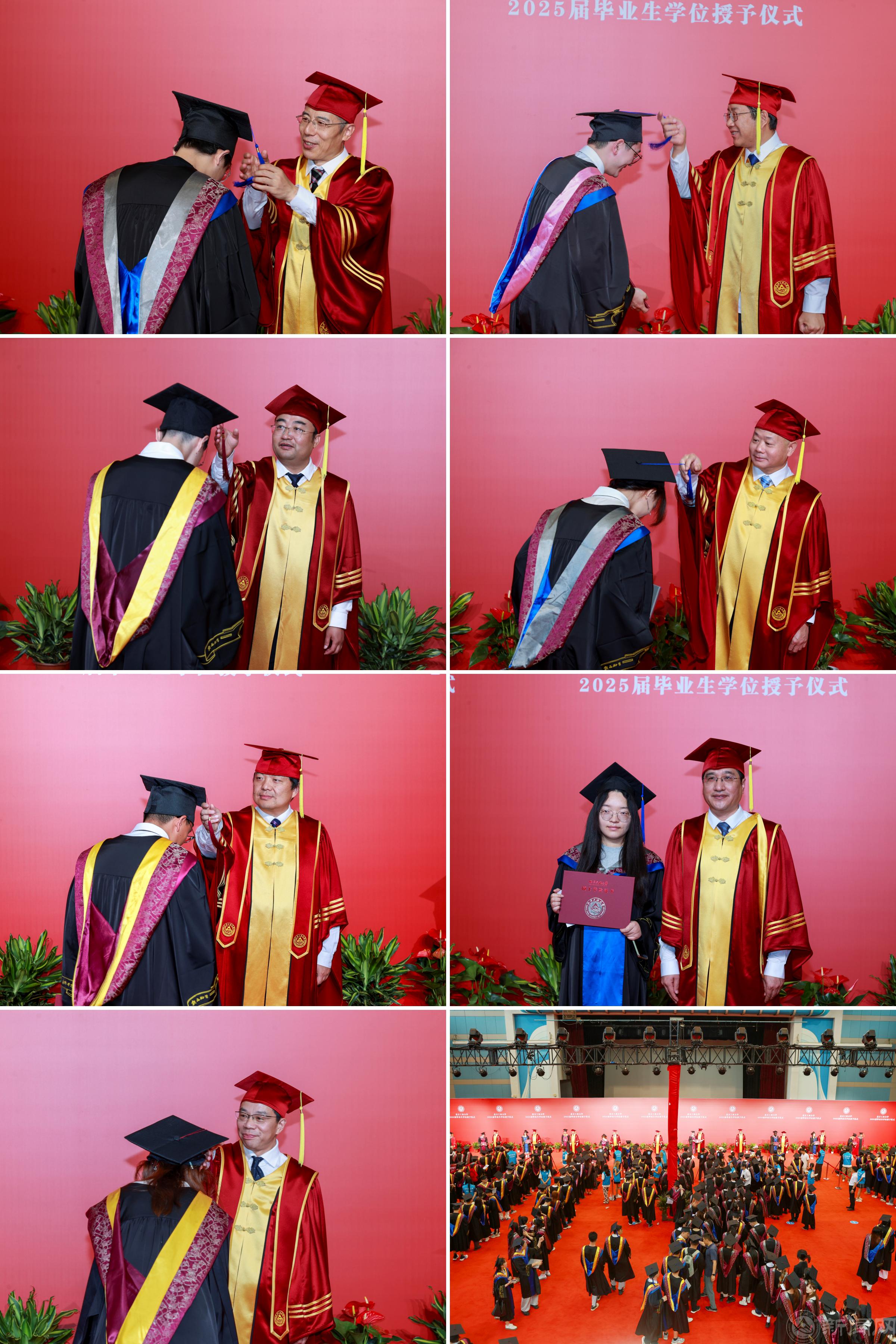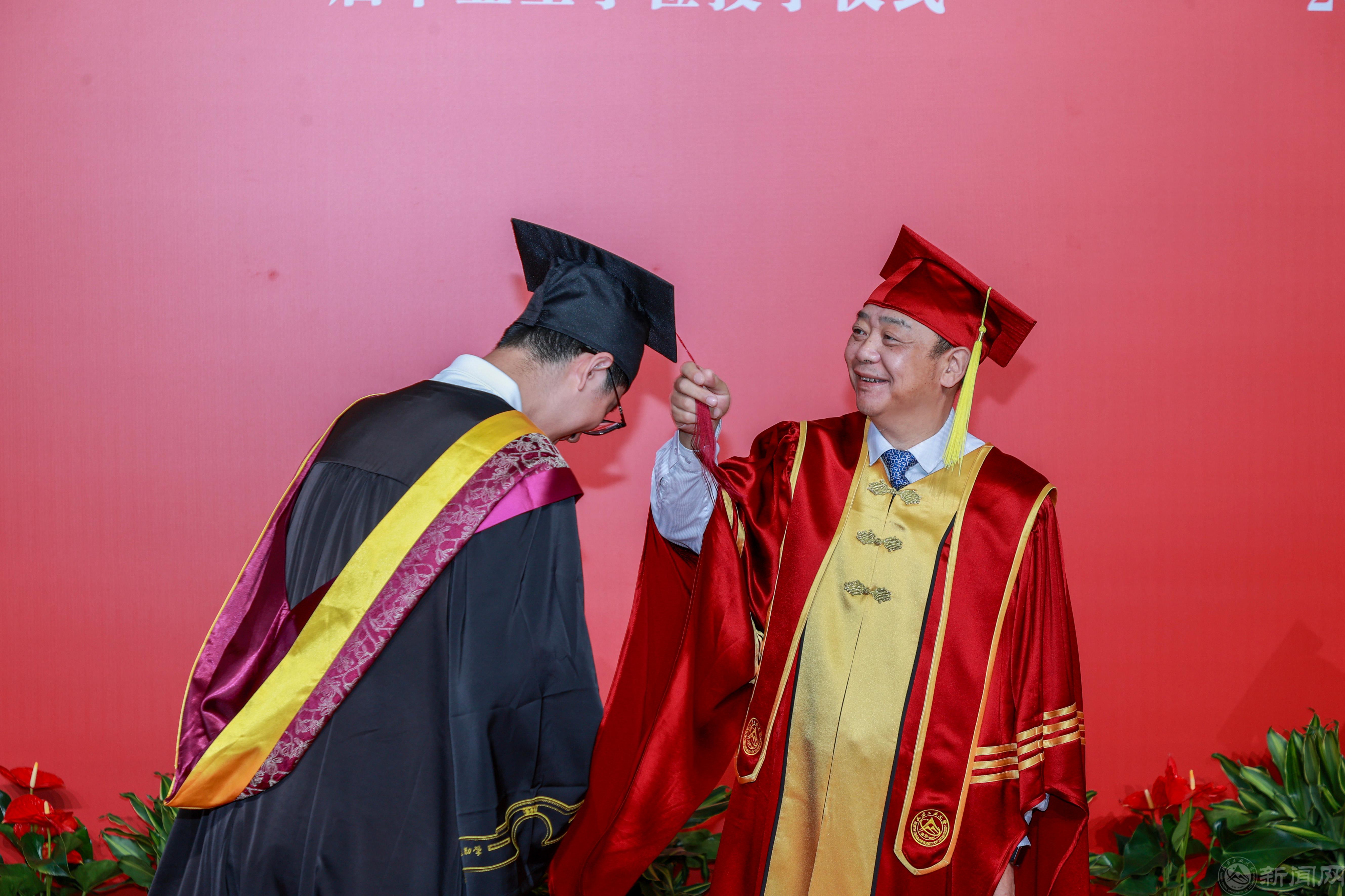 随后,学位授予仪式在体育馆二层举行,校领导、学院领导及学位委员会委员为毕业生们一一拨正流苏。