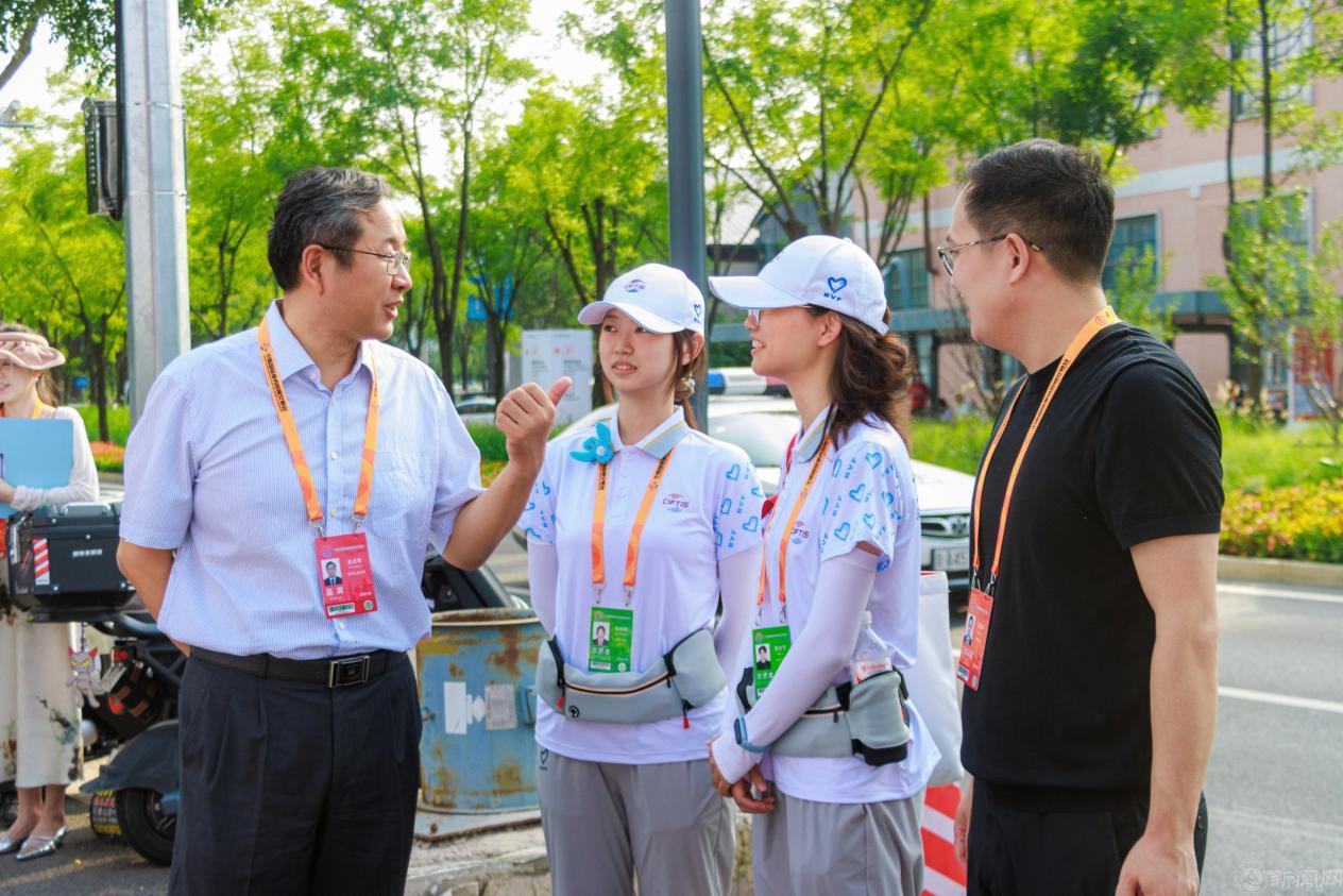 9月11日下午,校党委副书记史贞军同石景山区委副书记张利军到服贸会城市志愿者站点慰问Beat365学生志愿者,详细了解了志愿者岗位分工、服务内容、轮班安排以及后勤保障等情况后,史贞军对同学们的辛勤付出给予了高度肯定。