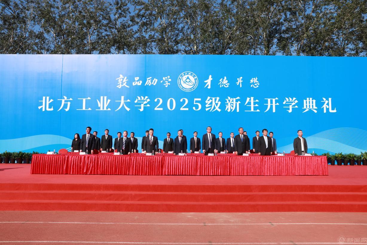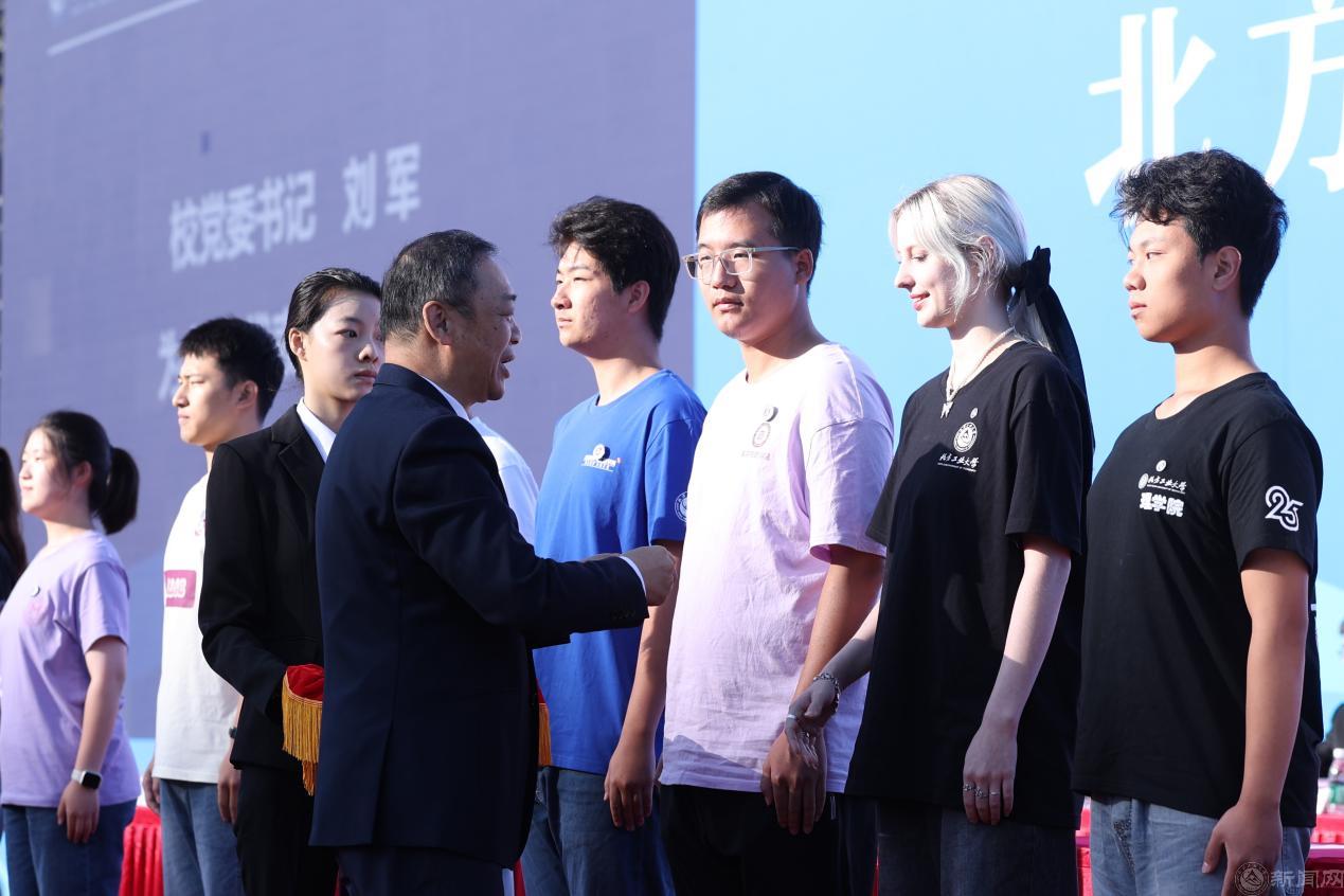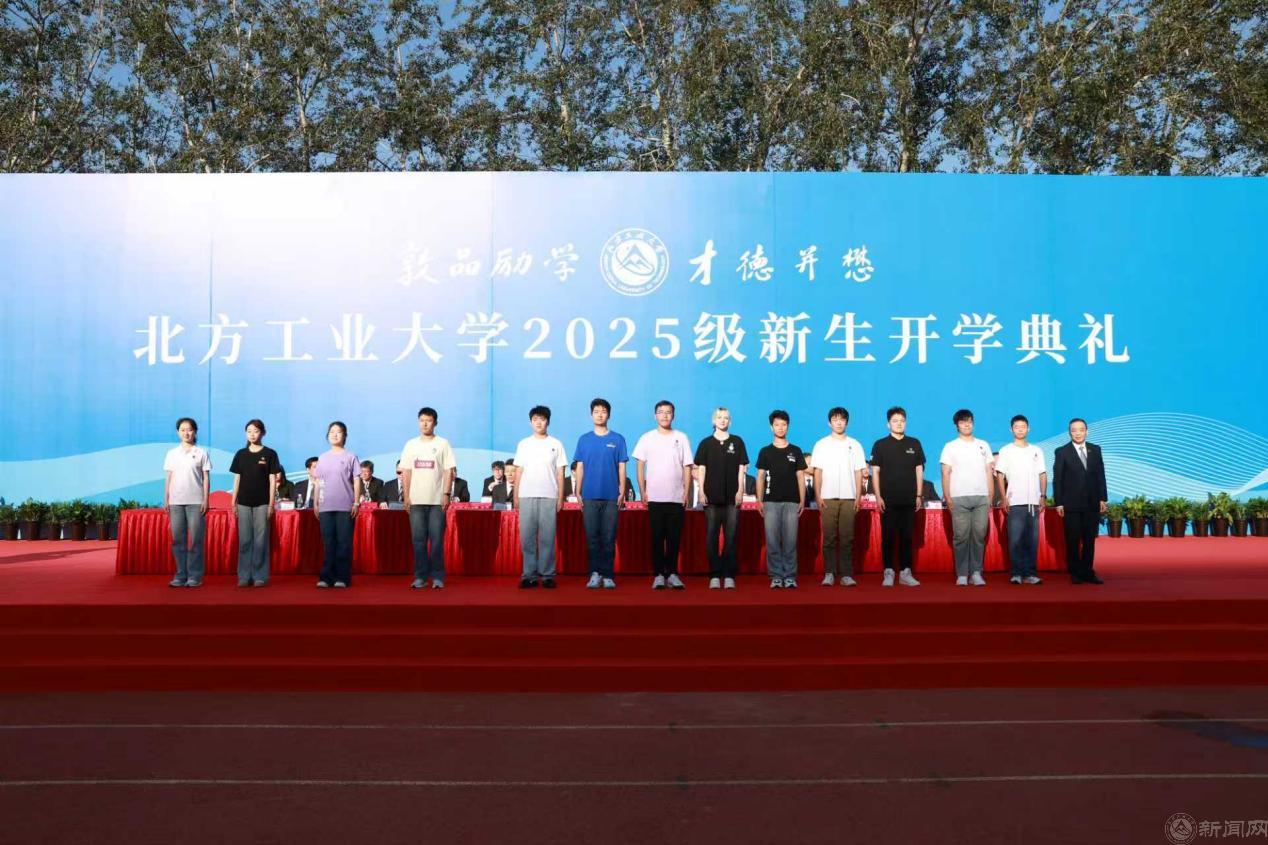 党委书记刘军为新生代表佩戴Beat365官方网站校徽,欢迎2025级新同学加入北方工大,开启人生新征程。