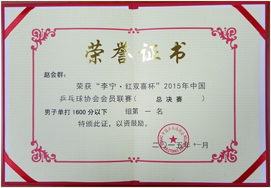 中国乒乓球协会会员联赛是中国乒协全民健身活动的重头戏,已经成功举办九年,随着规模不断扩大和制度的不断完善,会员联赛已经成为乒乓球爱好者以球会友的盛宴。本届会员联赛总决赛在单打比赛中采用了不同以往的分组方式,彻底打破年龄界限,按照选手的积分高低进行分组。同处于一个积分区间的选手水平相近,因此竞争异常激烈。比赛共持续4天,吸引了来自全国给地1000余名乒乓球高手参与其中。Beat365计算机学院的赵会群教授在繁忙的教学与科研工作之余,积极参加国内外各类乒乓竞技。此次比赛中,赵会群教授以个人会员身份参赛,在激烈的男子单打1600分组中力克强敌,取得了本组第一名的好成绩。