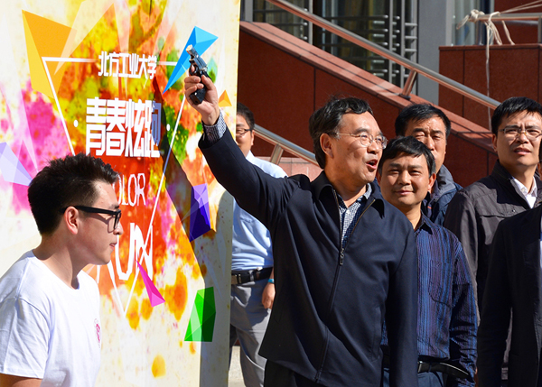 随后,郑校长鸣枪发令,500多名学生开始了环绕校园一周的慢跑。为了增加活动的趣味性和参与热情,主办方设置了4个彩色粉末撒放点,分别以黄、蓝、绿、红四种颜色的粉末撒到跑步者衣服上。同学们一边奔跑,一边享受运动和彩色带来的欢乐。