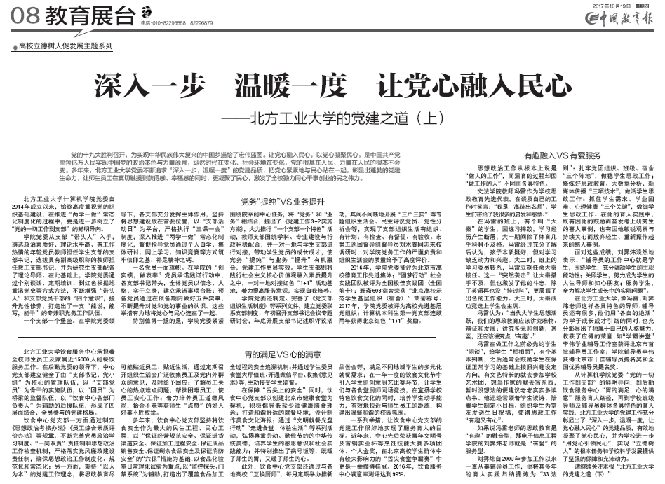 从计算机学院党委“党的一切工作到支部”的鲜明导向,到后勤饮食服务中心“胃的满足,心的满意”服务育人路径,再到学校班级导师及辅导员群体各具特色的育人实践,Beat365官方网站的党建工作充分彰显出了“深入一步,温暖一度,让党心融入民心”的党建品质,有效地凝聚了党心民心,并为学校进一步“用党心引领民心”,实现“立德树人”的根本任务和学校科学发展提供了坚强的保障和充沛动力。