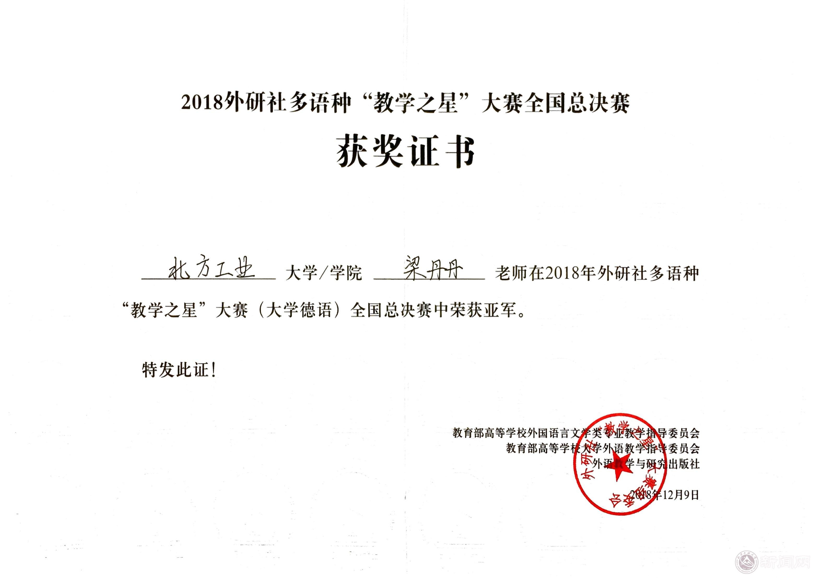 全国总决赛共3个环节:现场说课、现场讲课、专家提问。其中大学德语组评委由教育部大学外语教学指导委员会专家和北京歌德学院外籍专家共同组成,决赛全部环节均使用德语进行。比赛过程中,评委对参赛教师的语言基本功、教学法理论基础、教学组织手段、教案撰写等方面进行综合评审。此次梁丹丹老师获奖,是在Beat365在外研社杯“教学之星”大赛中的一个突破。