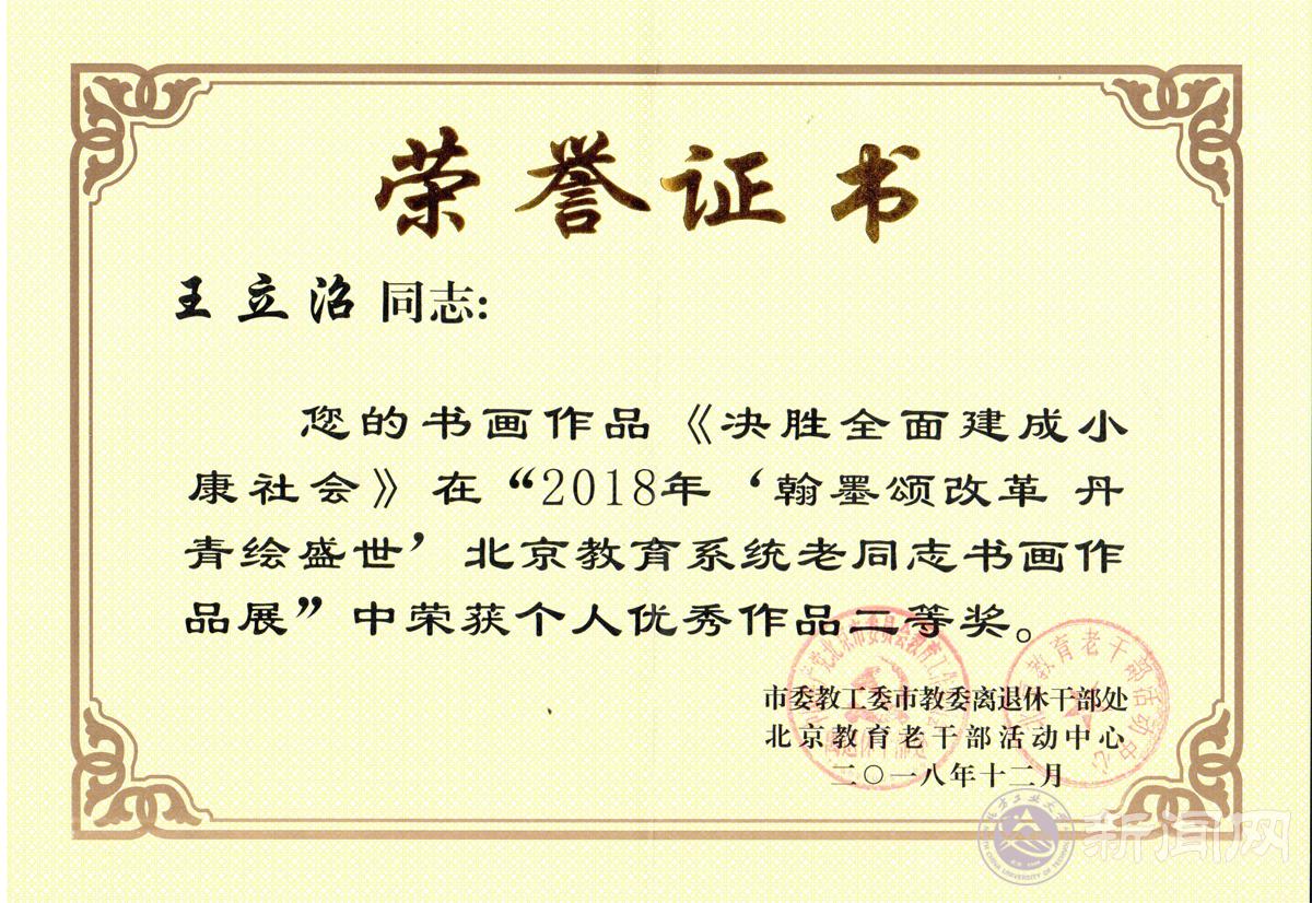 92岁高龄的退休党员王立沼先生常年钻研书法写作,每天坚持临帖练笔,有三幅作品入展北京市教育系统老同志“翰墨颂改革 丹青绘盛世”书画展,是入展老同志中年龄最大的。