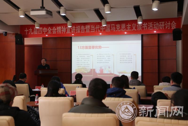在宣讲环节,马克思主义学院院长张加才以《中华民族伟大复兴的制度保障》为题,做了一次解读党的十九届四中全会精神的辅导报告,正式拉开了读书活动的序幕。