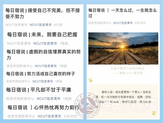 2021年4月,信息学院在前期“读一本励志书,开一个卧谈会,写一篇感想文”优斋读书计划的基础上,面向2020级全体宿舍征集优秀读后感,各宿舍积极响应、踊跃参加,共收到100余篇共计约10万字的读后感,最终遴选出了18篇特别优秀的感想。我们看到有同学从阅读中产生了共情,慷慨激昂诉说故事;也有同学从书中看见颓废的自己,落笔书写出自己的心得;还有同学仿佛醍醐灌顶,清晰描绘美好未来。为更广泛地传播同学们读书的所思所想,NCUT信息青年公众号每日推送一篇优秀文章“每日宿说”,促进读书计划的二次分享、深度分享。