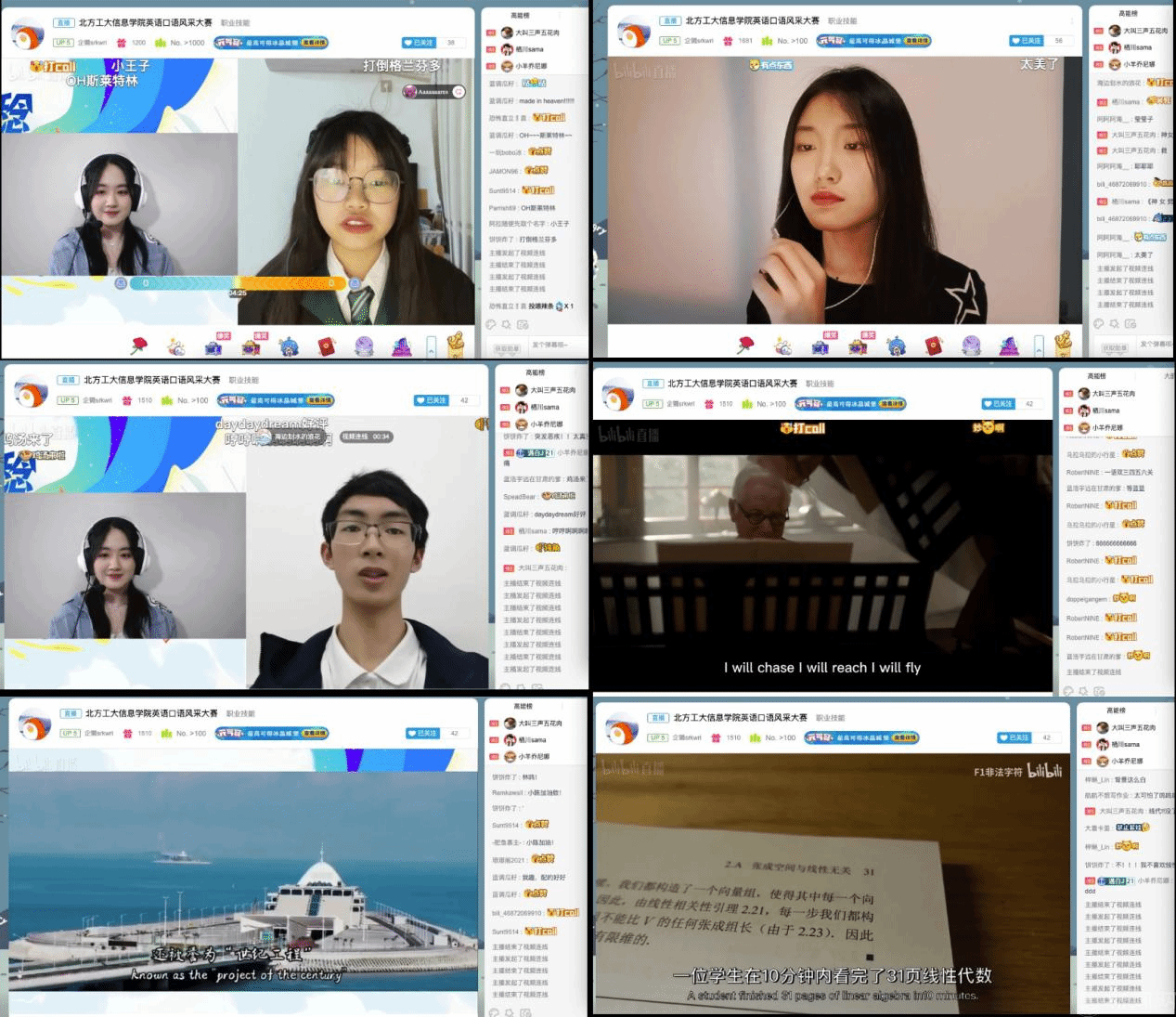 此次大赛由信息学院主办,本科21级年级学生会承办,初赛阶段同学们踊跃参赛提交作品40余份,最终15名同学进入决赛。口语风采大赛决赛采用Bilibili线上直播方式,同学们以独唱、朗诵、趣配音等丰富多样的形式呈现作品,电实验21班蓝浩宇为华为探索者精神海外宣传片配音,阐述了华为勇敢、拼搏、开放、合作的探索者文化;电实验-20班陈慧婷朗诵了《港珠澳大桥》,用流利的口语介绍了这座连接香港、广东珠海和澳门桥隧工程的建造背景和艰辛历程;电20-3班赵文萱演唱了英文歌曲《Trouble is a Friend》,用清澈的嗓音鼓励听众,虽然在生活中我们会遇到许多困难,但困难是激励我们不断前进的良药,也是通往成功道路上不可或缺的伙伴;还有许多同学选择了为《神探夏洛克》、《泰坦尼克号》、《疯狂动物城》等经典影视片段配音。直播过程中,选手们表达流利,情感饱满,为观众呈现了一场视觉和听觉的盛宴。