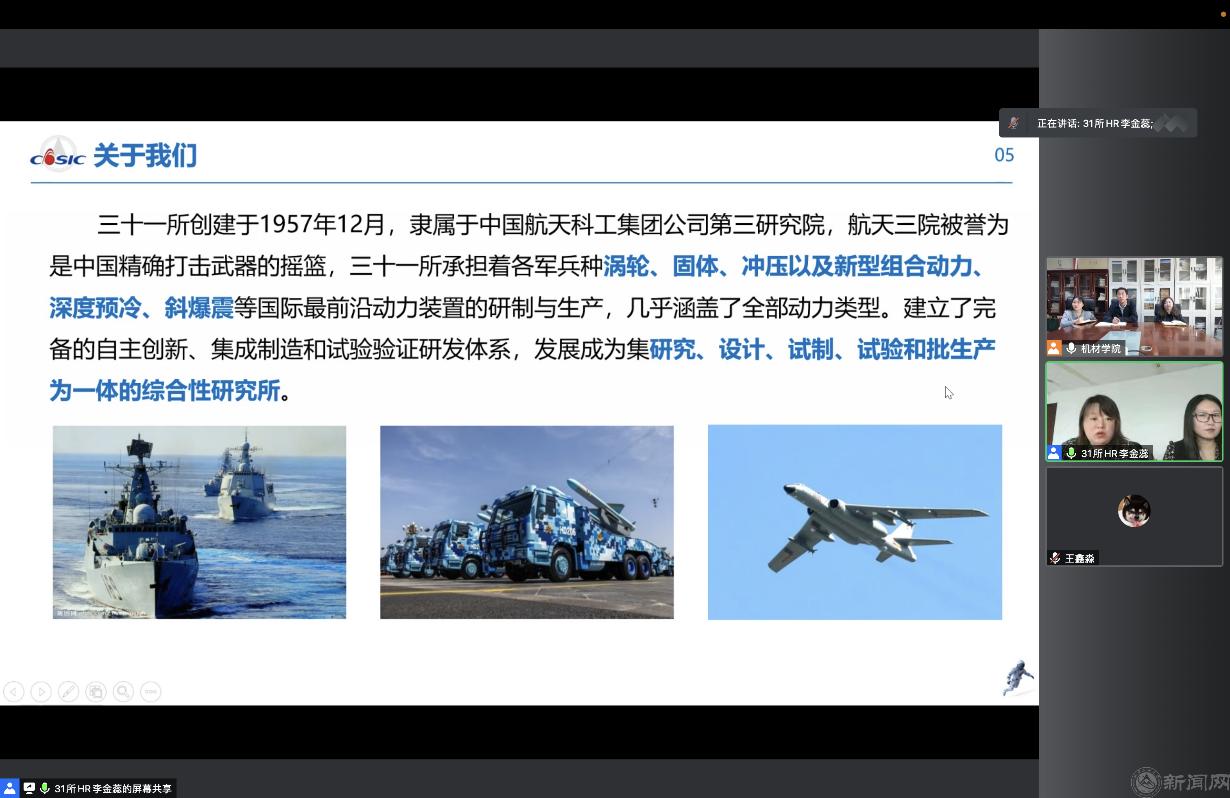 10月13日上午,机械与材料工程学院在博才楼214会议室与中国航天科工集团三院三十一所开展线上访企拓岗交流活动。航天三院三十一所人力资源处副处长刘一丹、人事工作负责人李金蕊,机材学院党委书记王文革、院长刘峰斌、党委副书记石卉、就业辅导员赵梦彤参加本次交流活动。