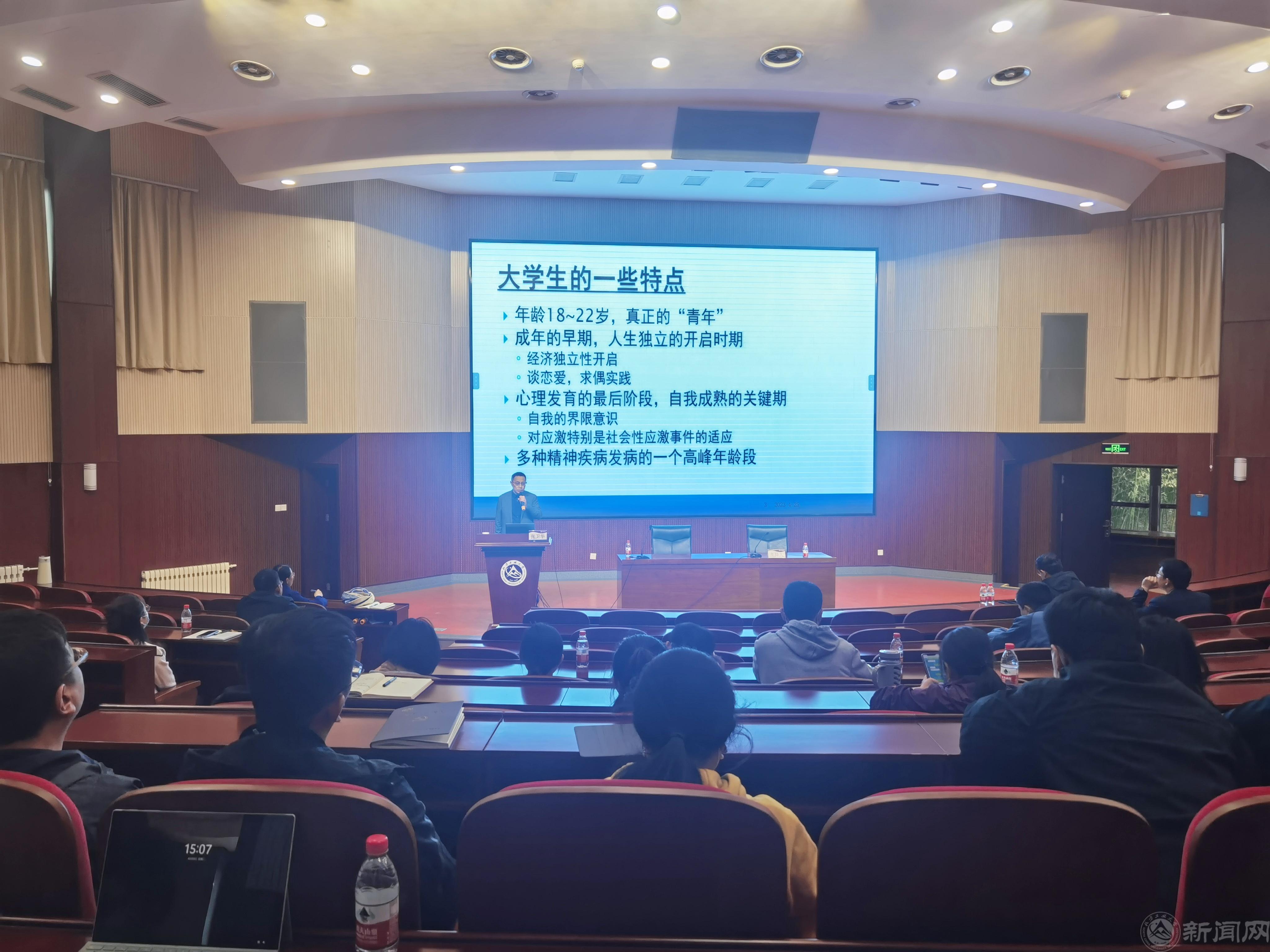 北京大学第六医院精神科副主任医师张卫华做了专题报告。张卫华是中国医师协会科学普及分会常务委员、中国睡眠研究会睡眠医学教育委员会常务委员,常年担任中央广播电视总台、北京广播电视总台、人民网等网络平台特约嘉宾,具有丰富的理论研究和实践工作经验。他以“大学生心理疾病的识别与药物治疗”为主题,通过对大学生精神疾病的特点、分类、识别、应对四个方面进行专业诠释,强调从医学视角和法律视角出发,在工作中做到专注、耐心、理解、尊重,并结合当前精神类药物的科普介绍,强调了科学用药、动态管理、合理监护的工作要点。