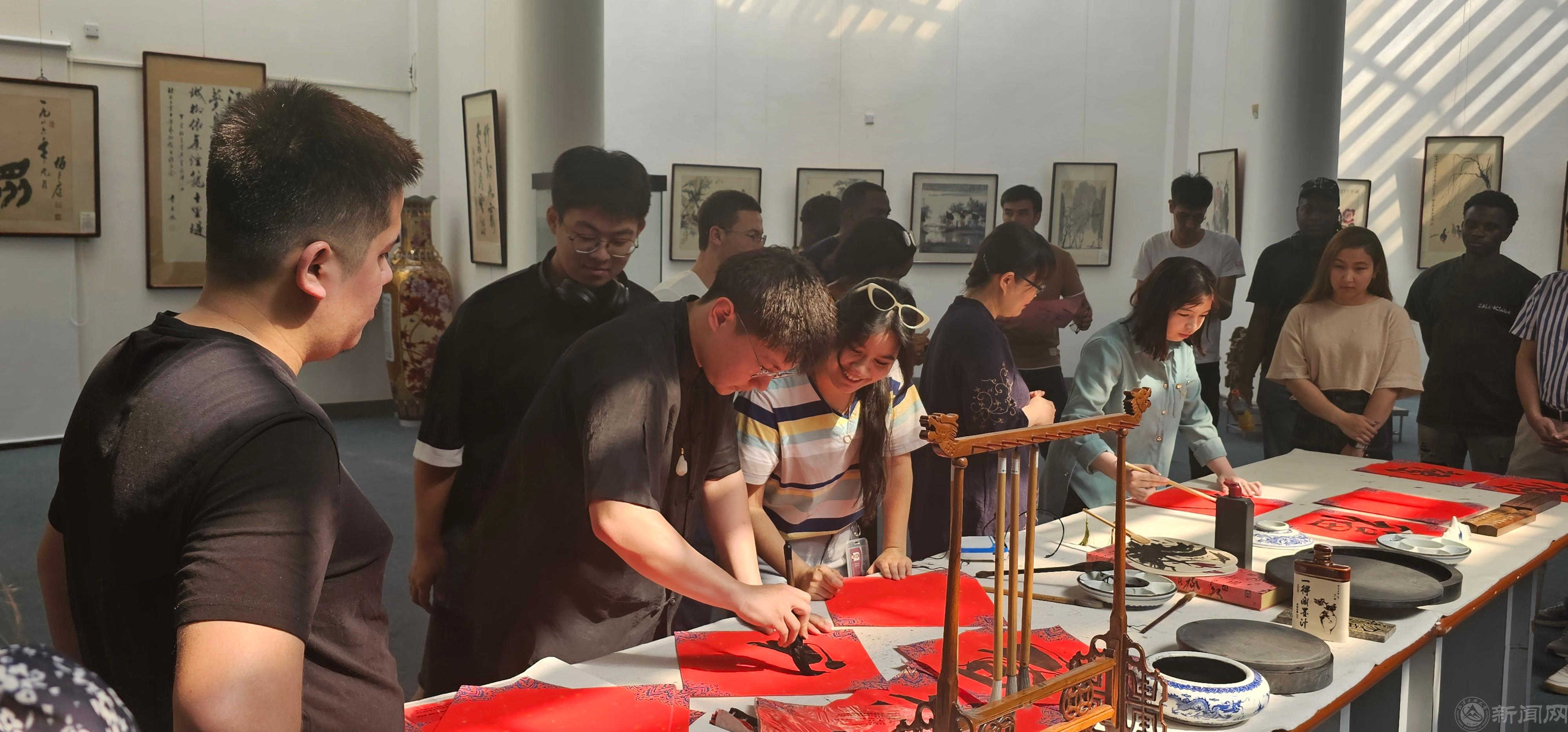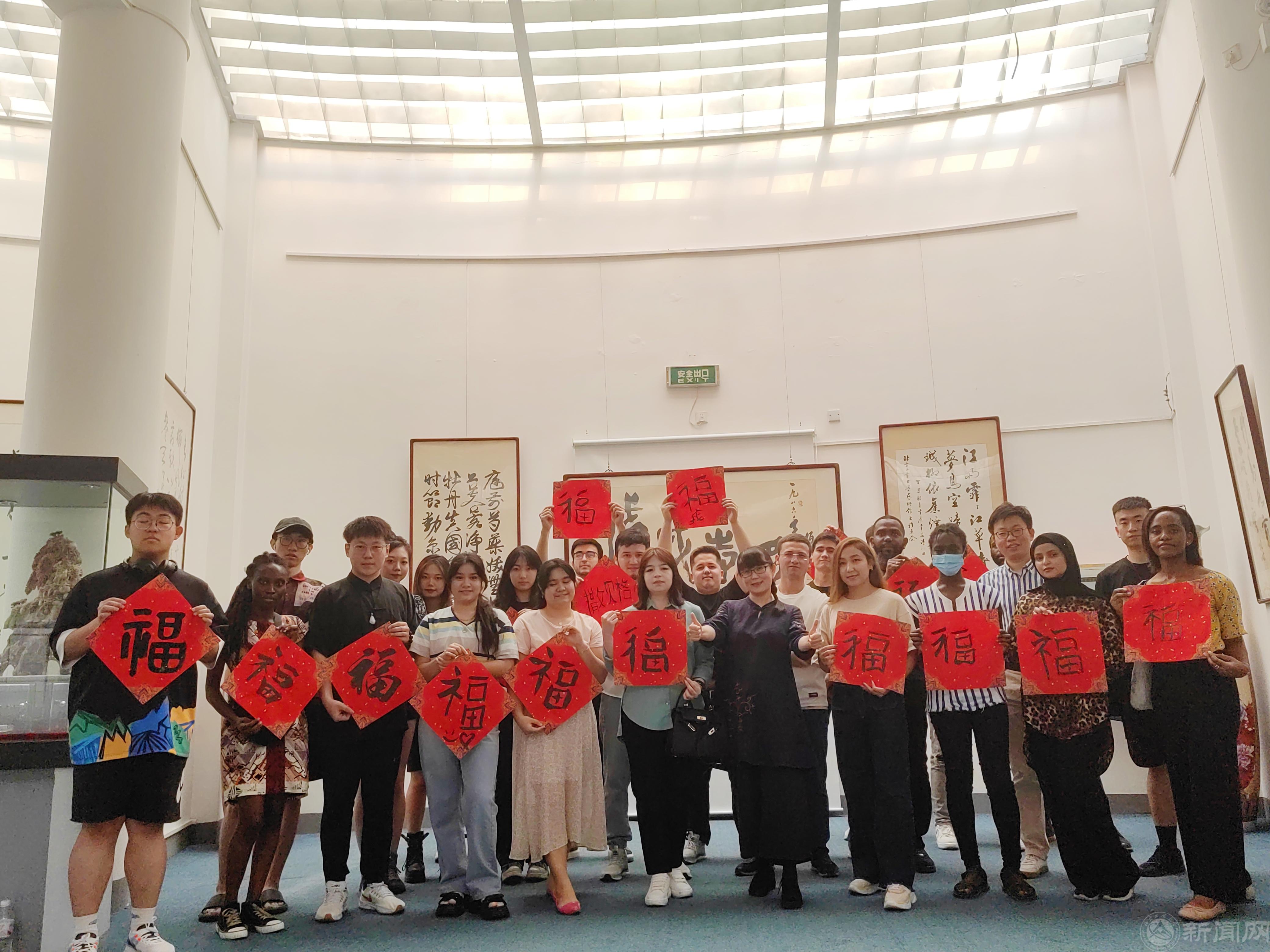 参观结束后,刘琳老师带领艺术馆工作坊的王元、张钰卿、黄张珺尧、周冠霖等同学为留学生现场演示“福”字的写法。留学生们积极参与其中,亲自体验,现场热情高涨,气氛融洽和谐。