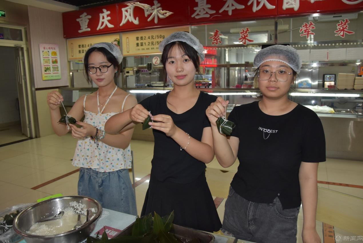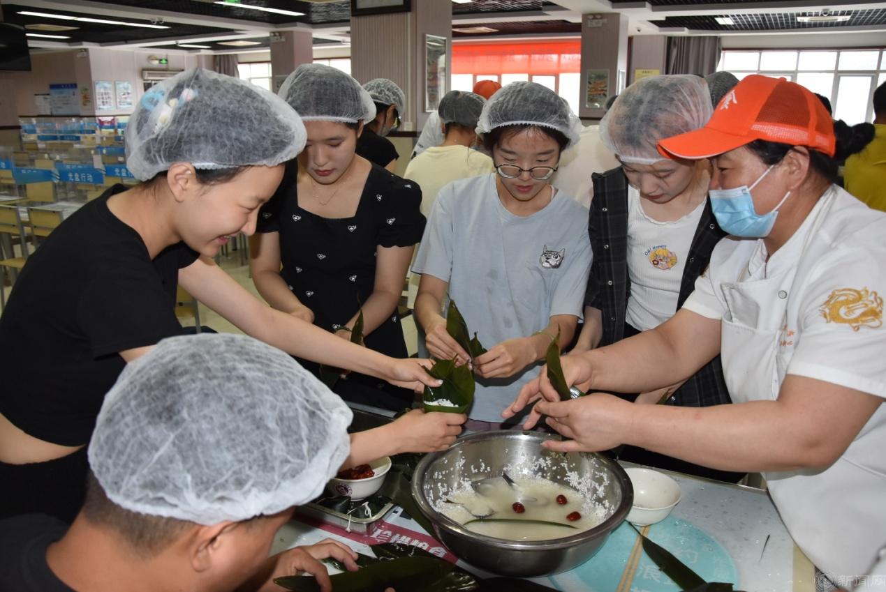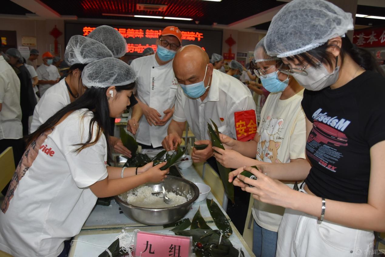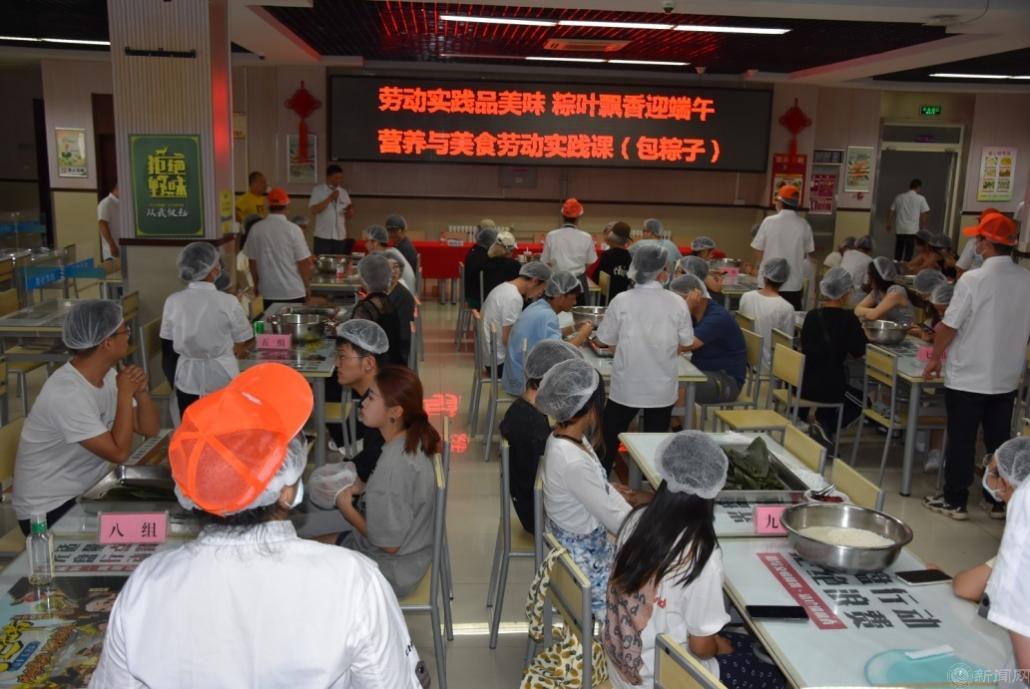 这堂别开生面的劳动教育课由知识讲解、方法演示、动手实操、质量点评、后厨观摩、成果品鉴等几个环节组成。饮食服务中心的工作人员向同学们讲解了端午节吃粽子的历史起源和节日风俗,说明了各地因饮食习惯不同造成口味上咸粽和甜粽的区别,介绍了不同地域使用的不同馅料,详细讲解并示范了包粽子的具体步骤。