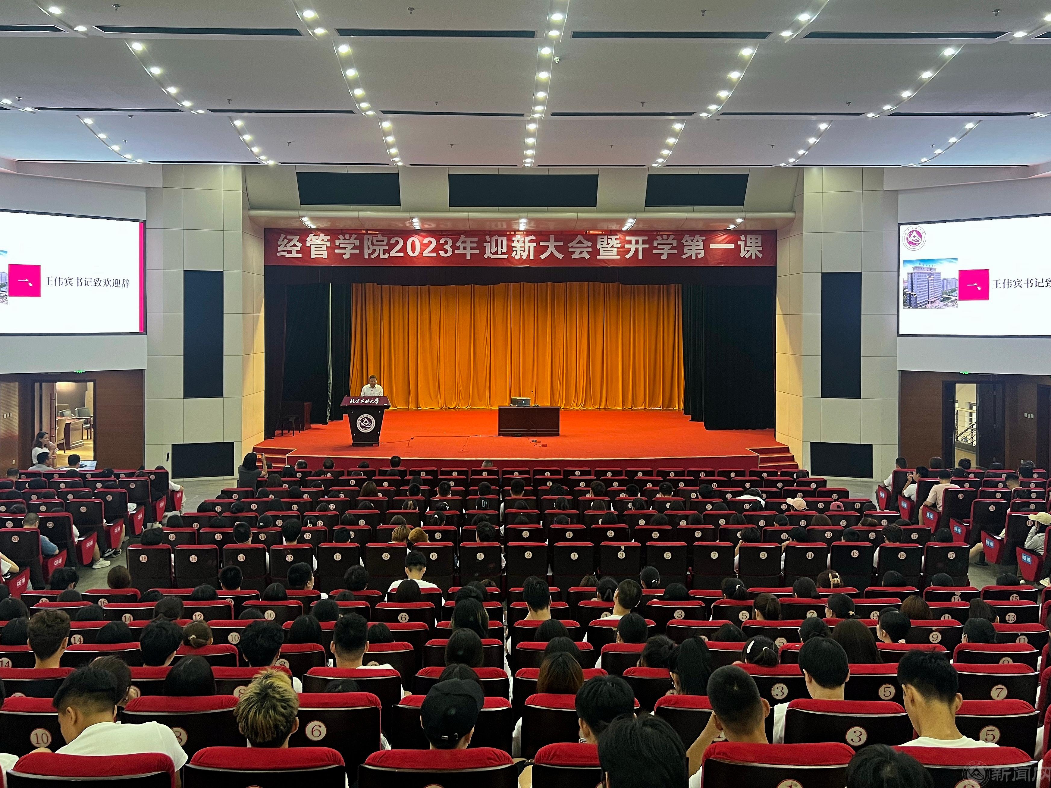 新学年,新起点,新征程,为帮助新生树立正确的奋斗目标,尽快适应校园学习生活,9月6日上午,经济管理学院2023年迎新大会暨开学第一课在图书信息楼报告厅举行。学院领导班子成员、各系主任、新生班导师、各年级辅导员、全体2023级新生参加本次活动。大会由学院党委副书记王帏主持。