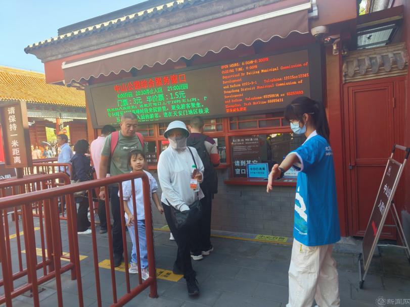 志愿者们身着蓝马甲,分别在中山公园、鼓楼进行引导游客、维持检票秩序、解答游客问题等工作,充分展现出了北京青年学子的良好精神风貌。在中山公园西门的服务岗位上,志愿者们经常收到游客关于去北海公园的路线等旅游相关问题。志愿者合理设计路线图给游客耐心精准指引,让游客的出行变得更加便利。在中山公园东门,早上10点迎来买票高峰期,志愿者们岗位前置,提前告知游客与门票有关的注意事项,加快了买票的进度,减轻了园区工作人员的负担。遇到语言不通的外国游客时,志愿者们会积极上前与他们沟通,协助他们购票并尽快进园参观。